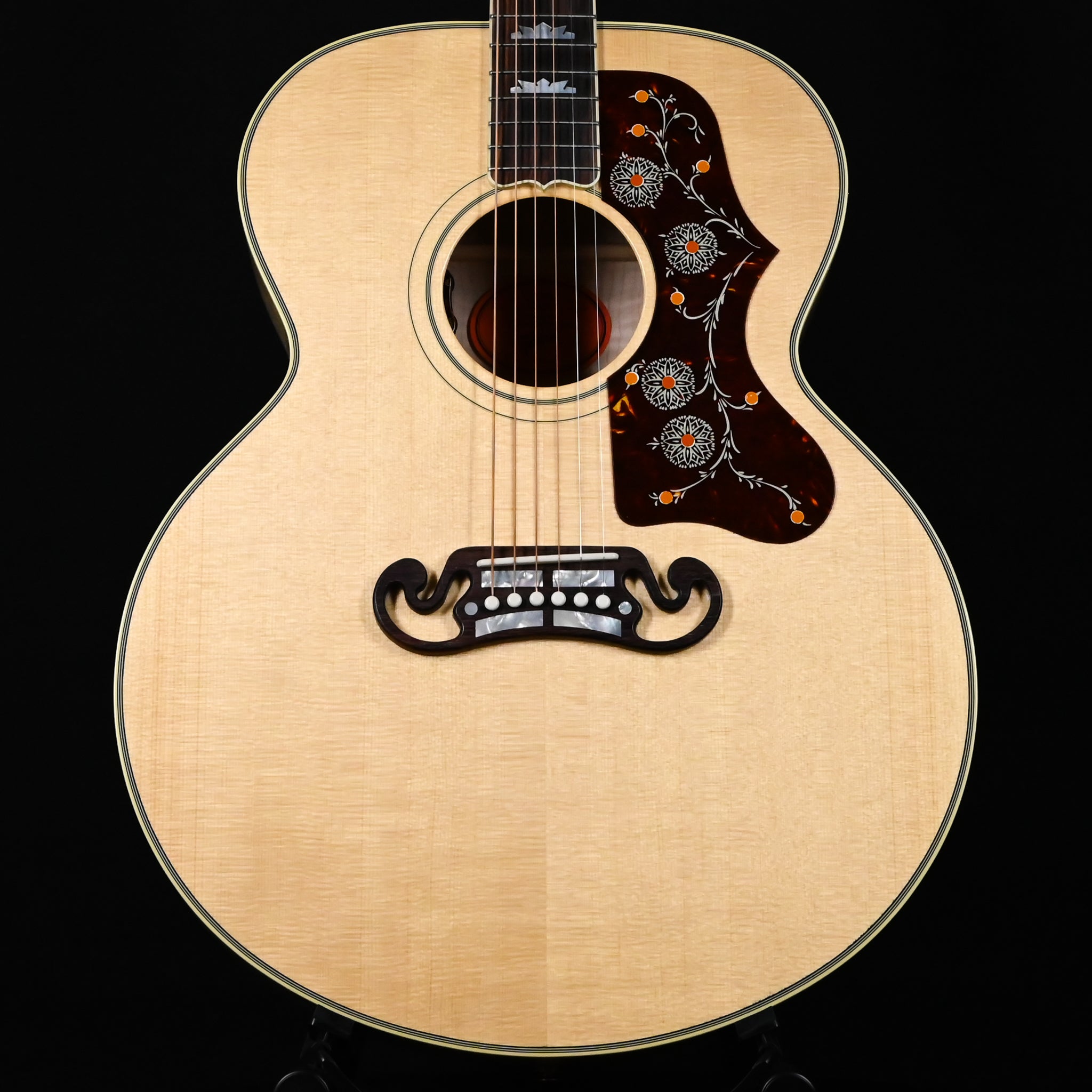 The Gibson SJ-200 is the world's most famous acoustic guitar and earned its designation as the "King of the Flat-Tops." Since its release in 1937, its wide use by American artists has made the Super Jumbo one of the most widely played acoustic guitars of our time. The most striking features of the new SJ-200 Original include the carved four bar Moustache bridge, an engraved tortoise pickguard, mother-of-pearl crown fretboard and headstock inlay, and exquisite flamed maple back and sides. The SJ-200 is an American original with its shape and elegant appearance.