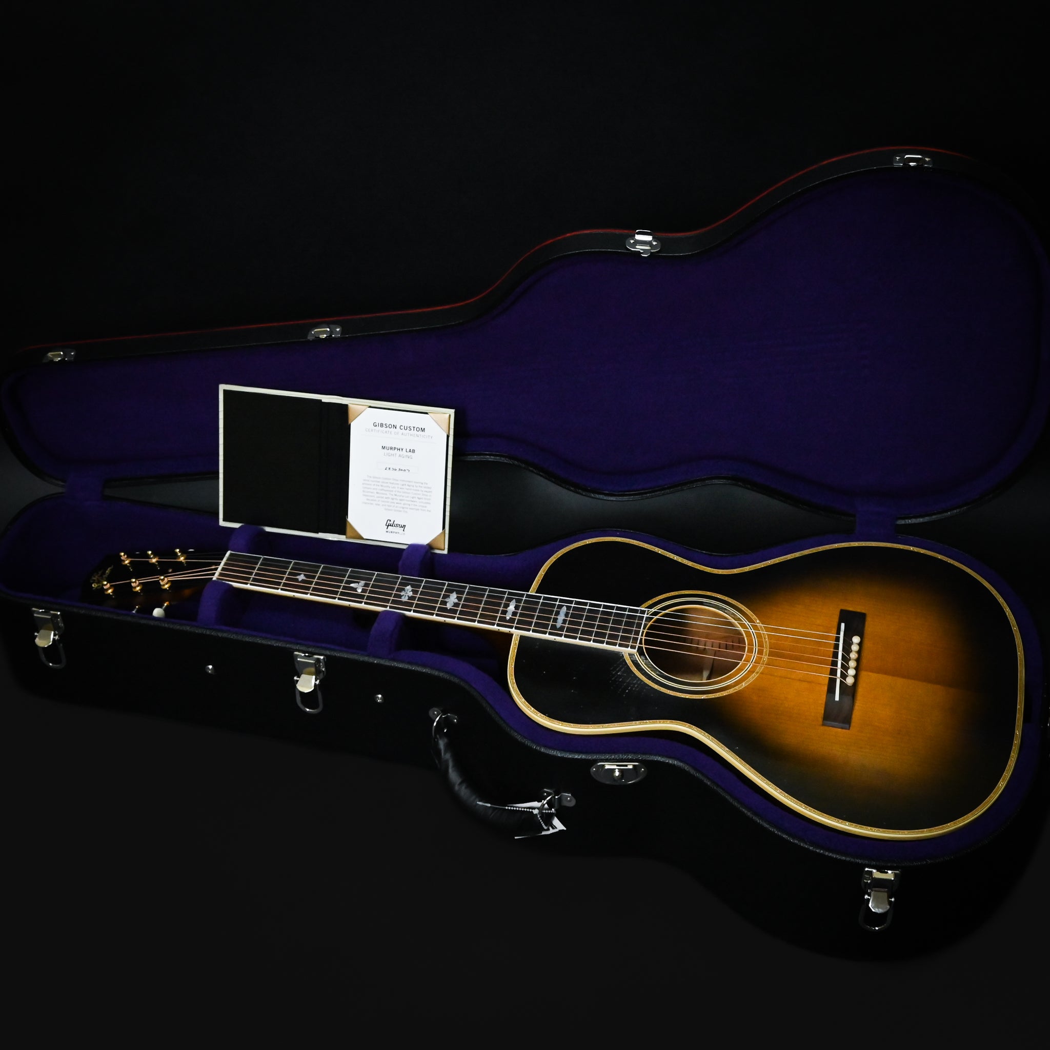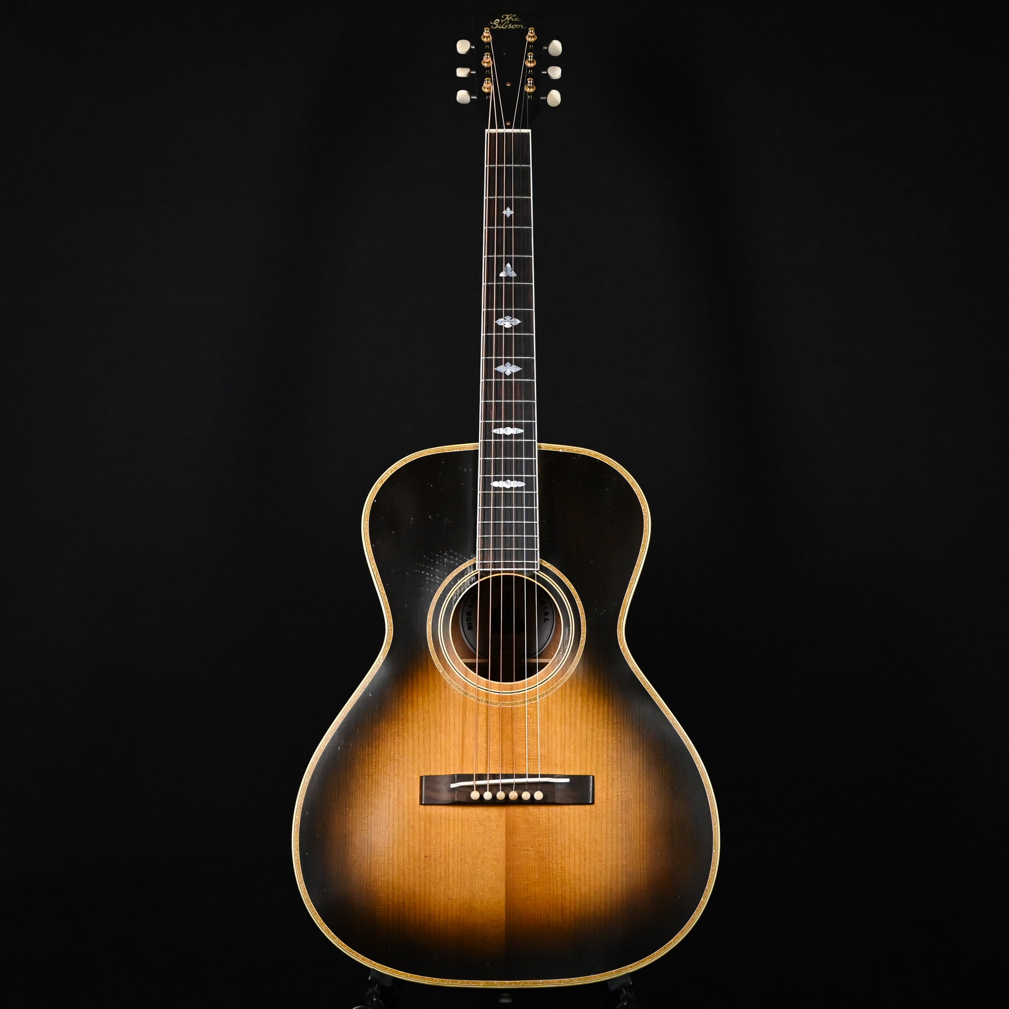 Now, Gibson Custom is proud to introduce the 1929 Nick Lucas Special Light Aged. Based on those early artist models, the mahogany body has a similar shape as the Gibson L-00, but it is significantly deeper, with an approximate 4.082” body depth at the head and 4.52” depth at the tail. The bound body features multi-ply top binding with gold sparkle and multi-ply back binding. The top is thermally aged red spruce, and the L-2 style rosette also features gold sparkle, which is one of the visual hallmarks of the Nick Lucas Special. The mahogany neck joins the body at the 12th fret and has a C-shaped profile. The bound rosewood fretboard is equipped with 20 frets and is adorned with mother-of-pearl Nick Lucas inlays with engraved details. Gold Waverly tuners with ivoroid oval buttons are installed on the headstock, which also features a vintage-style “The Gibson” logo in mother-of-pearl. The rosewood rectangular open slot bridge has a bone saddle, and the nut and bridge pins are also bone. The Argentine Grey finish features Light Aging from the artisans of the Murphy Lab. The Murphy Lab Light Aged finish treatment, paired with lightly aged hardware, simulates decades of light play wear, giving it the unique character, vibe, and feel of an original example from the Gibson Golden Era. The 1929 Nick Lucas Special Light Aged comes packed in a red line-style hardshell case. Here’s your opportunity to own one of the most distinctive-sounding acoustic guitars that Gibson has ever produced–a small-bodied masterpiece with serious depth and a big sound to match.