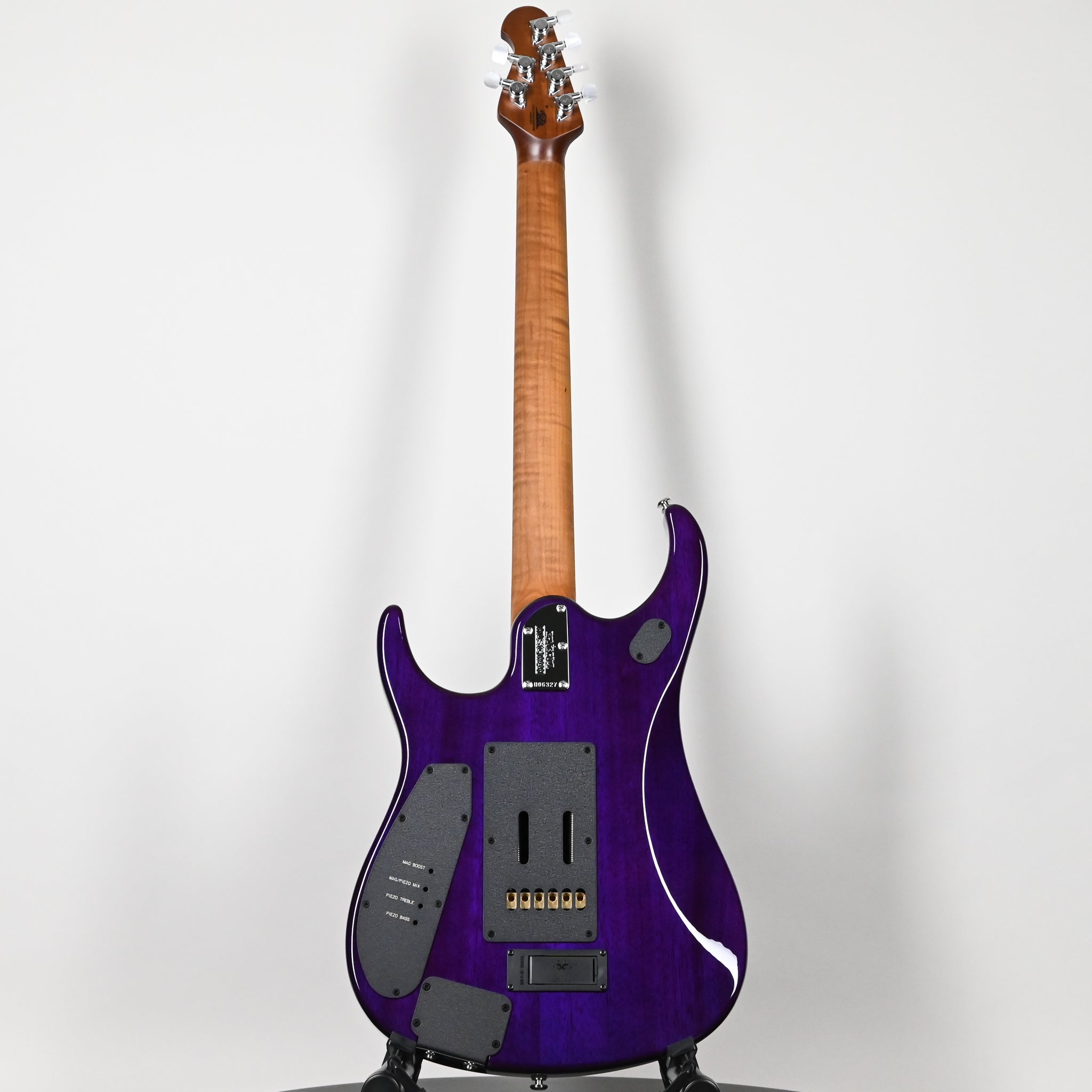 The JP15 features a lightweight okoume body with your choice of a quilted or flame maple top, offered in striking Red Tide, Green Tiger Eye, Ultramarine, and Amber Waves finishes. Its roasted figured maple neck and fingerboard deliver a smooth, fast-playing surface enhanced by stainless steel frets and a hand-rubbed oil and wax finish for natural comfort. Electronics include DiMarzio Illuminator pickups, a piezo-equipped bridge for realistic acoustic tones, and an onboard 20+dB gain boost for added punch and tonal range. The piezo system supports mono or stereo output, letting you route magnetic and piezo signals through separate chains. Two 3-way toggle switches give you full control—one selects between magnetic, piezo, or combined output, while the other toggles between bridge, neck, or both magnetic pickups. A push/push tone knob splits the coils in the middle position for added versatility. Additional features include a floating Music Man JP tremolo, locking Schaller tuners, and a Mono case, with 6- and 7-string configurations available.