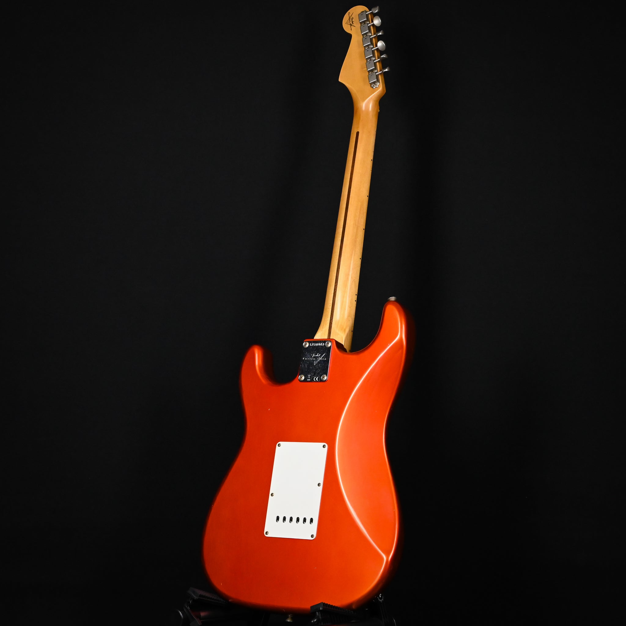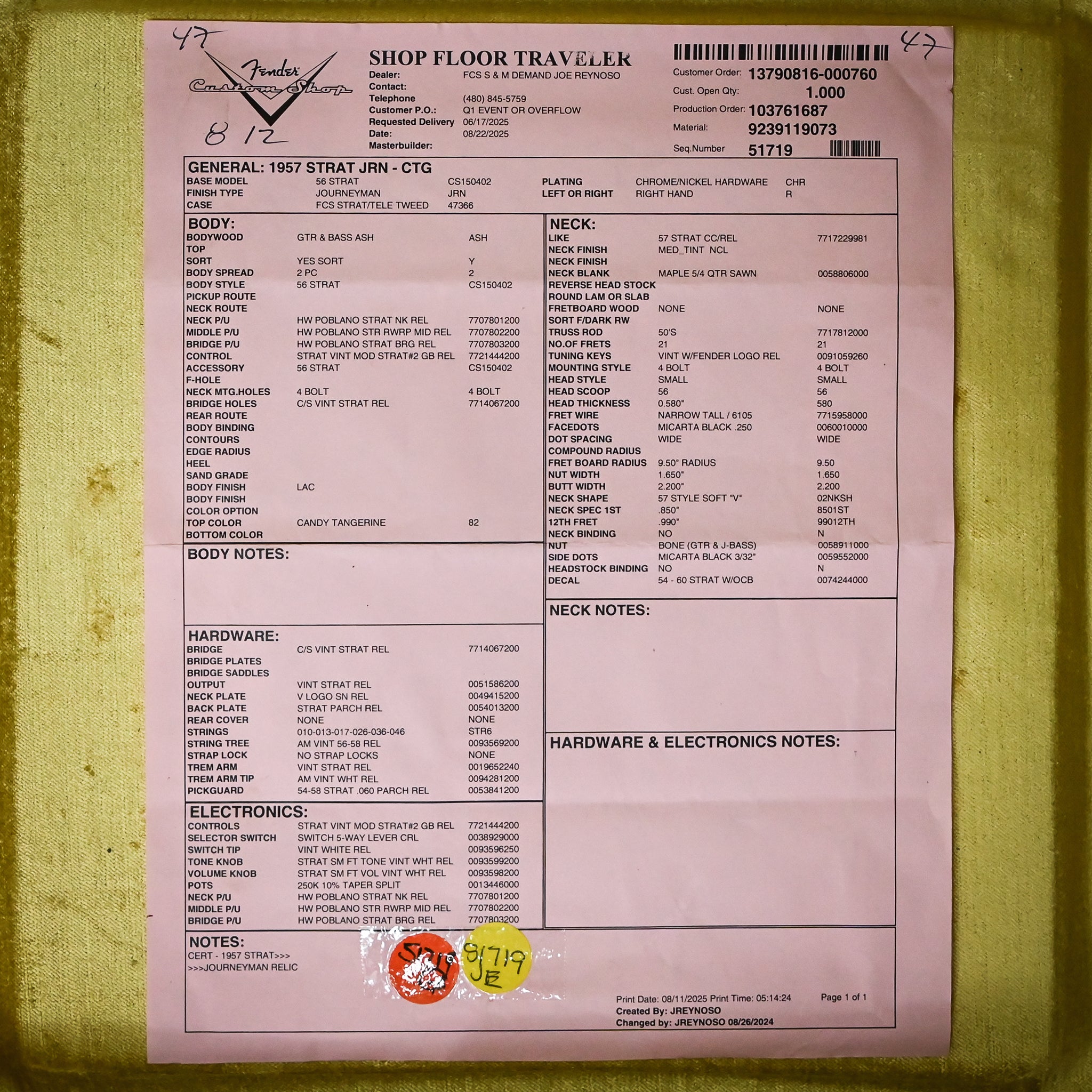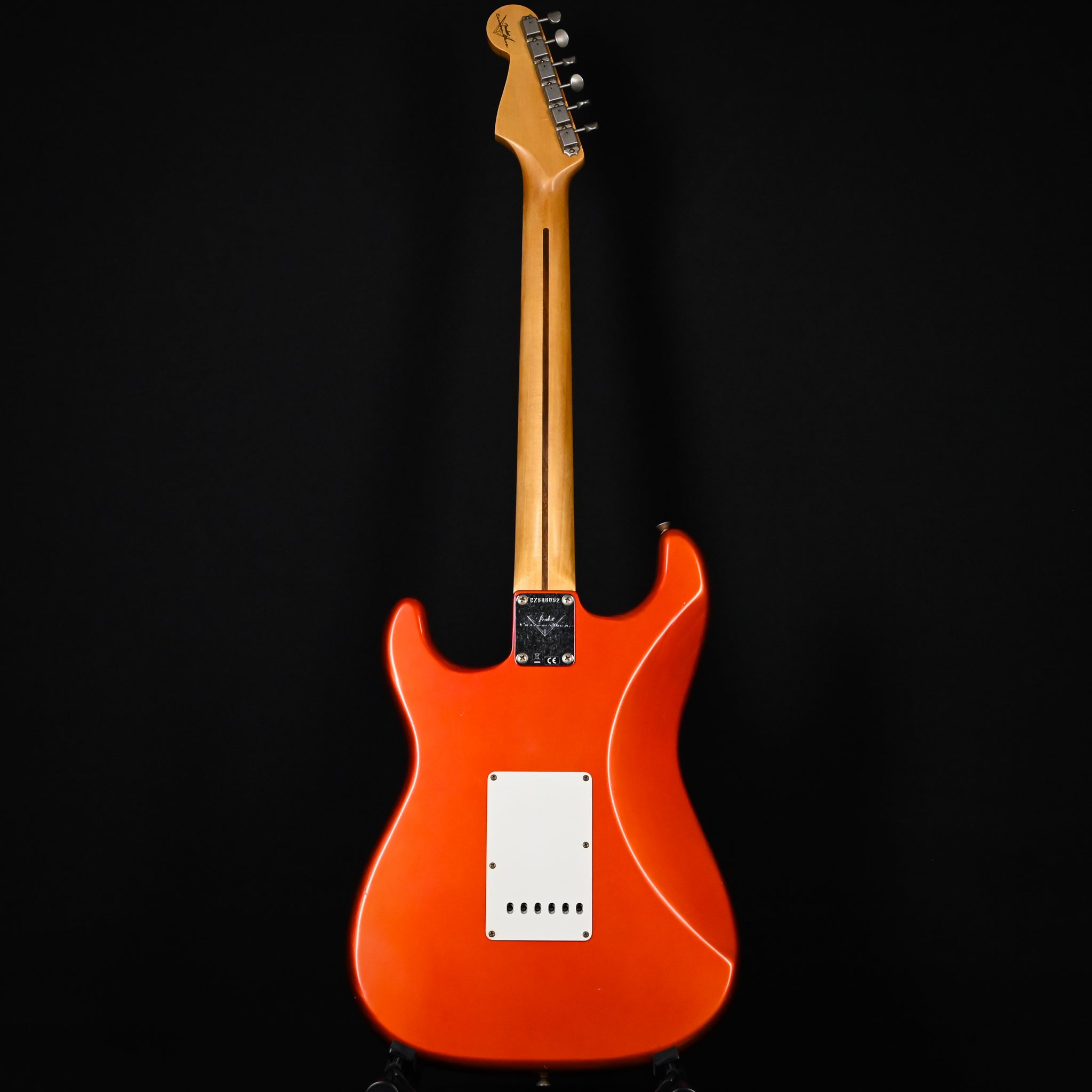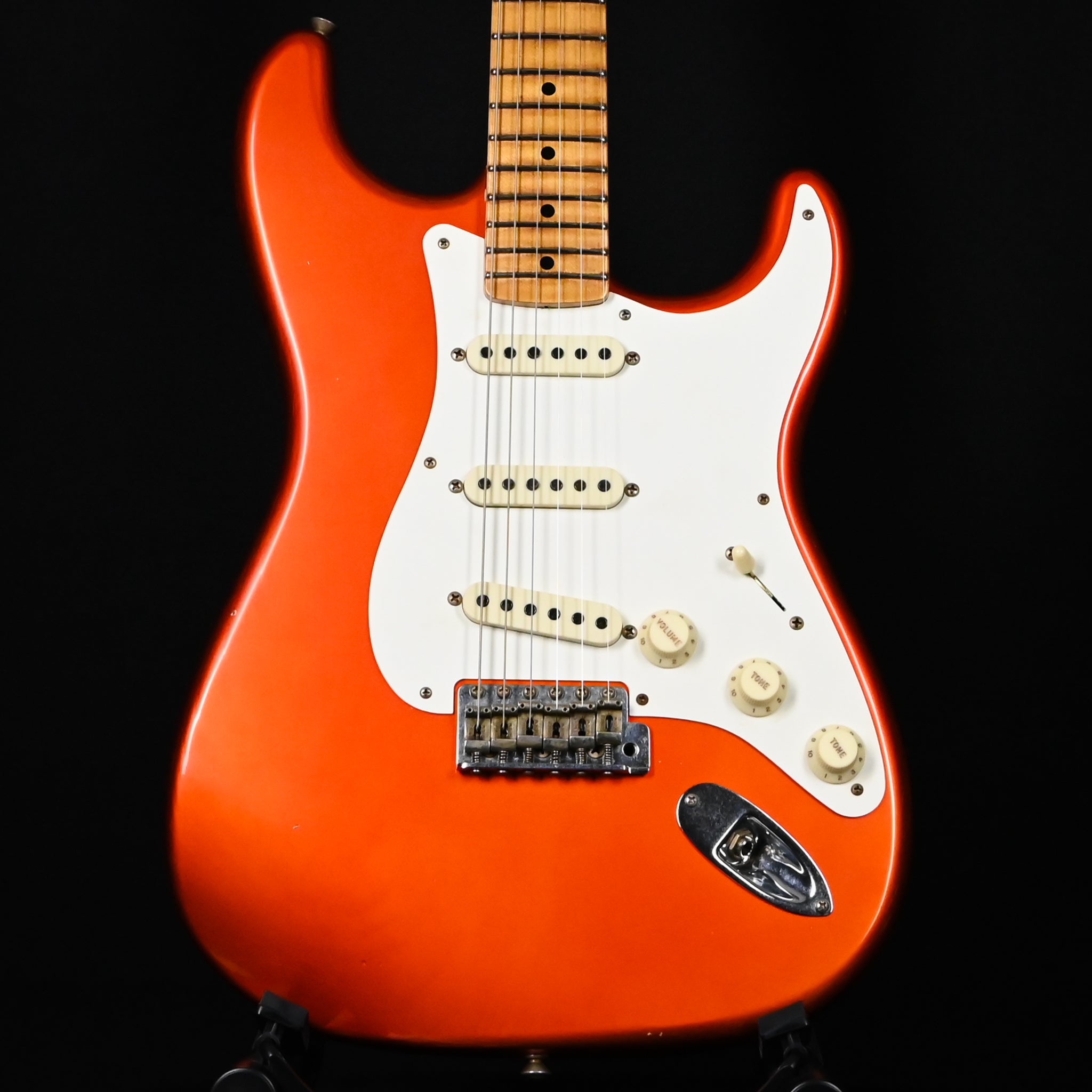Body Finish: Candy Tangerine, Journeyman Body Material: 2 Piece Sorted Ash Neck Pickup: Handwound Poblano Strat Middle Pickup: Handwound Poblano Strat RWRP Bridge Pickup: Handwound Poblano Strat Configuration: SSS Controls: 1 Volume, 2 Tone (Strat Vintage Mod Wiring #2 w/ Grease Bucket Tone Circuit) Fingerboard Material: Maple Fingerboard Radius: 9.50” Radius Fret Size: Narrow Tall Hardware Finish: Chrome
