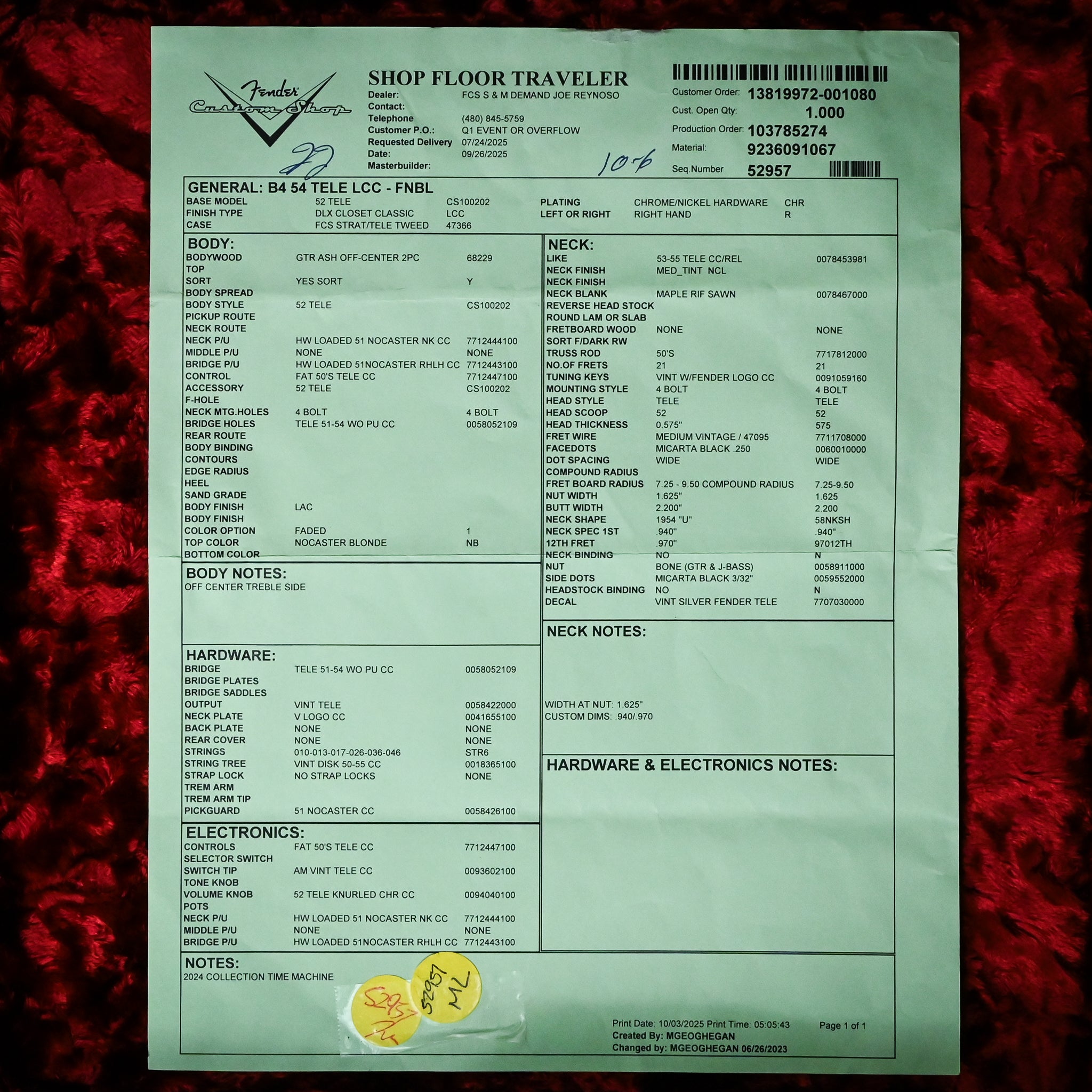 Bridge: '51-'54 Tele Bridge Neck Finish: Medium Tint Nitrocellulose Lacquer Neck Material: Rift Sawn Maple Neck Shape: 1954 "U"