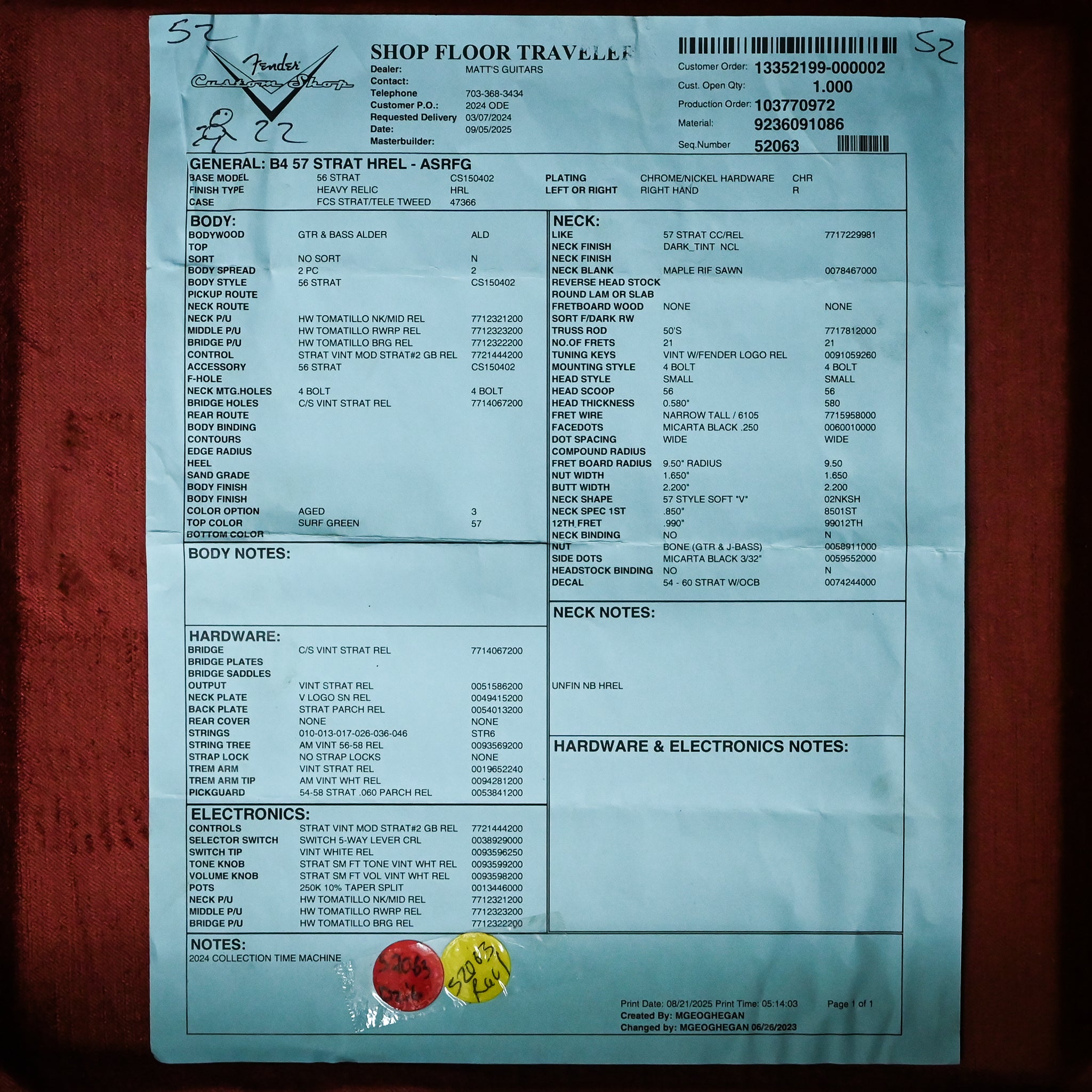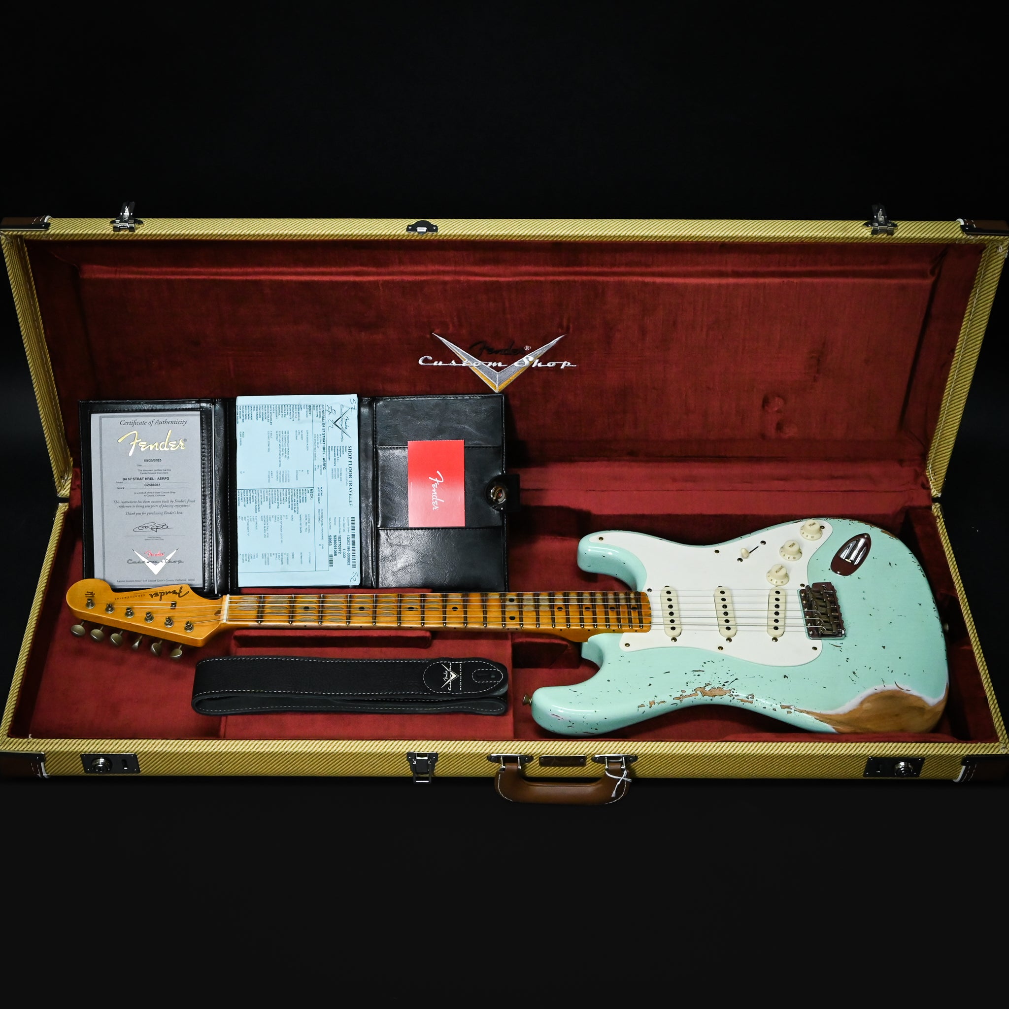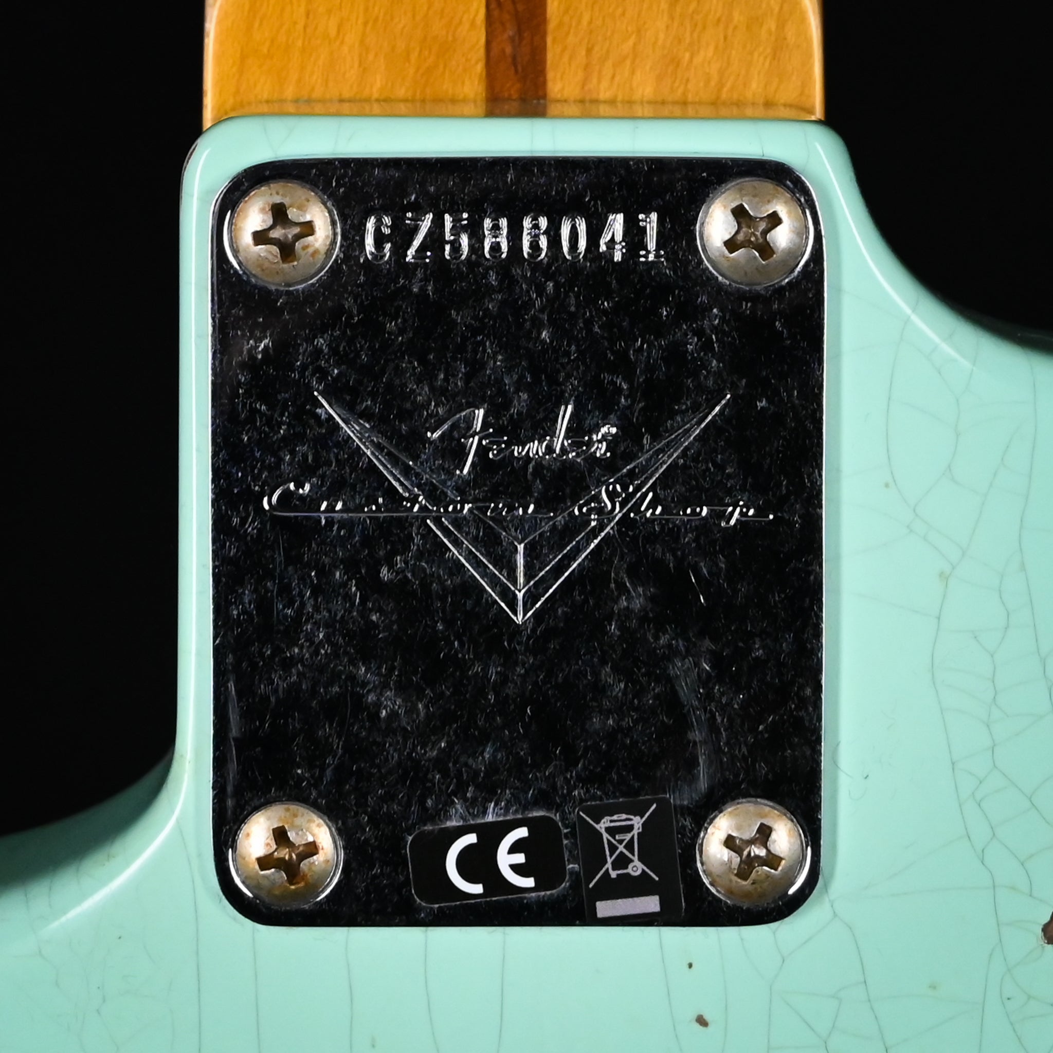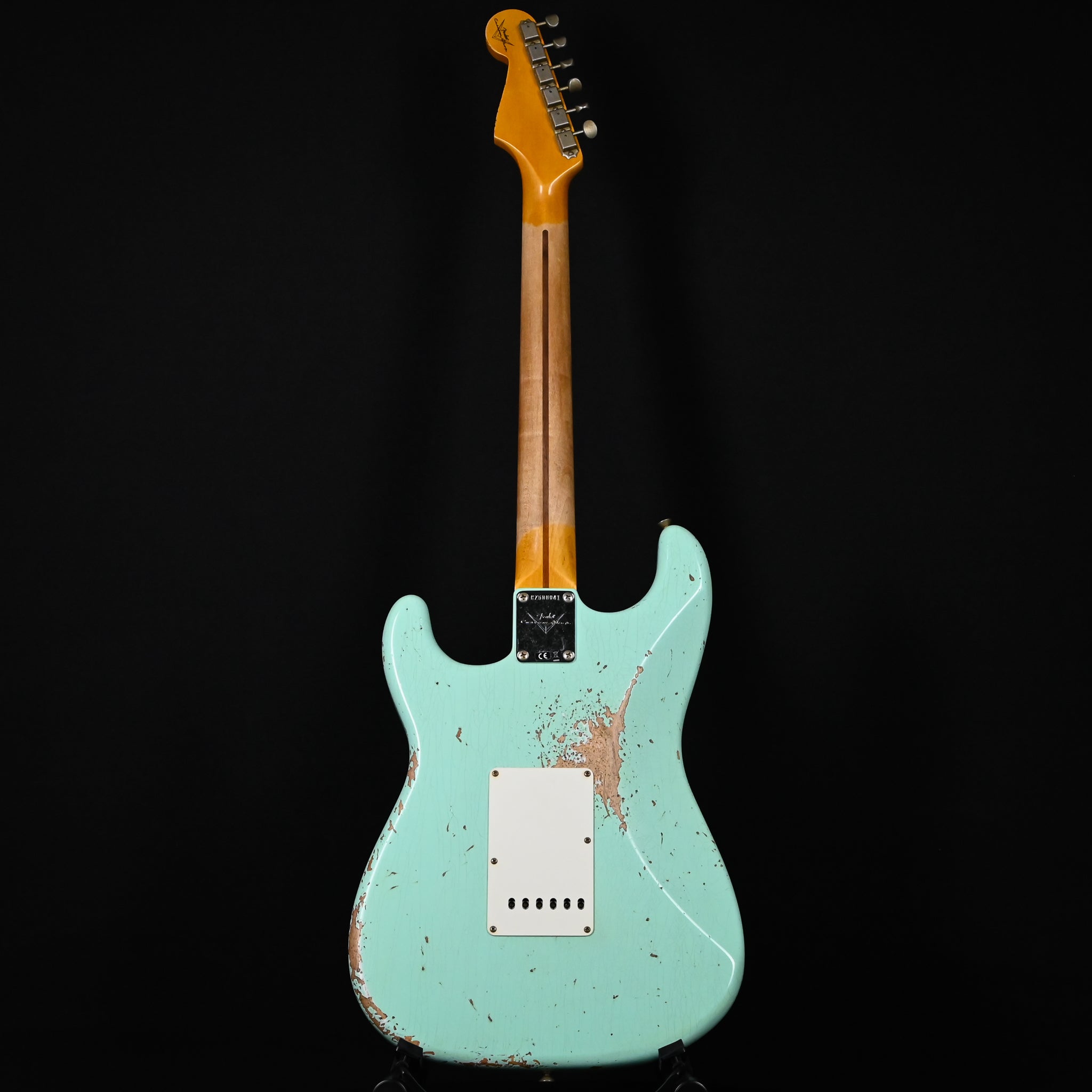 Body Finish: Aged Surf Green, Heavy Relic Body Material: 2 Piece Alder Neck Pickup: Handwound Tomatillo Middle Pickup: Handwound Tomatillo RWRP Bridge Pickup: Handwound Tomatillo Configuration: SSS Controls: 1 Volume, 2 Tone (Strat Vintage Mod Wiring #2 w/ Grease Bucket Tone Circuit) Fingerboard Material: Maple Fingerboard Radius: 9.50” Radius Fret Size: Narrow Tall Hardware Finish: Chrome