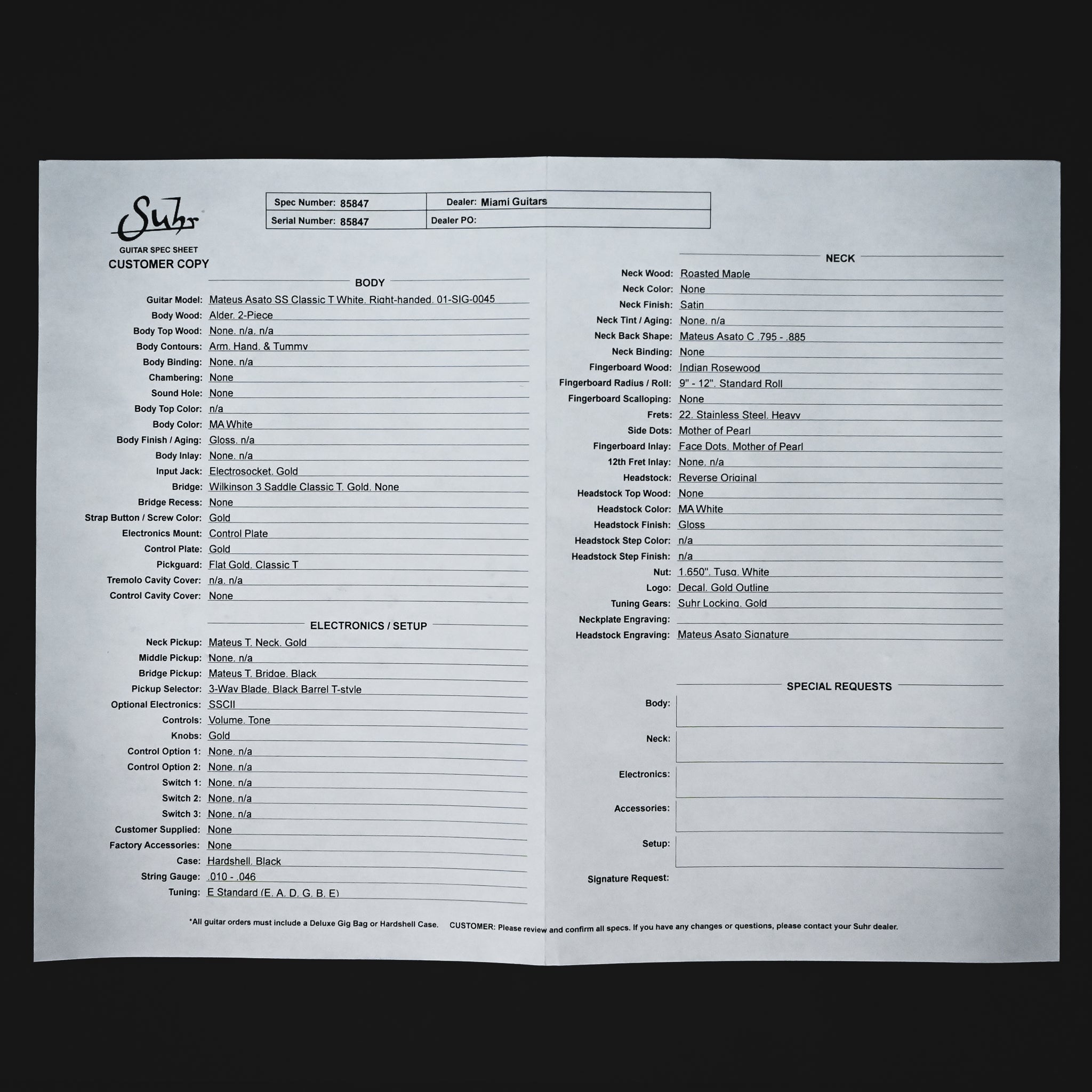 A striking evolution of Mateus’ first Classic T design in 2020, this guitar delivers a punchy and articulate tone that’s perfect for both clean and overdriven playing styles. The Classic T’s alder body and roasted maple neck provide a balanced and resonant foundation for Mateus’ legendary tone, while the all-new gold pickguard and reversed headstock adds a touch of elegance and class.