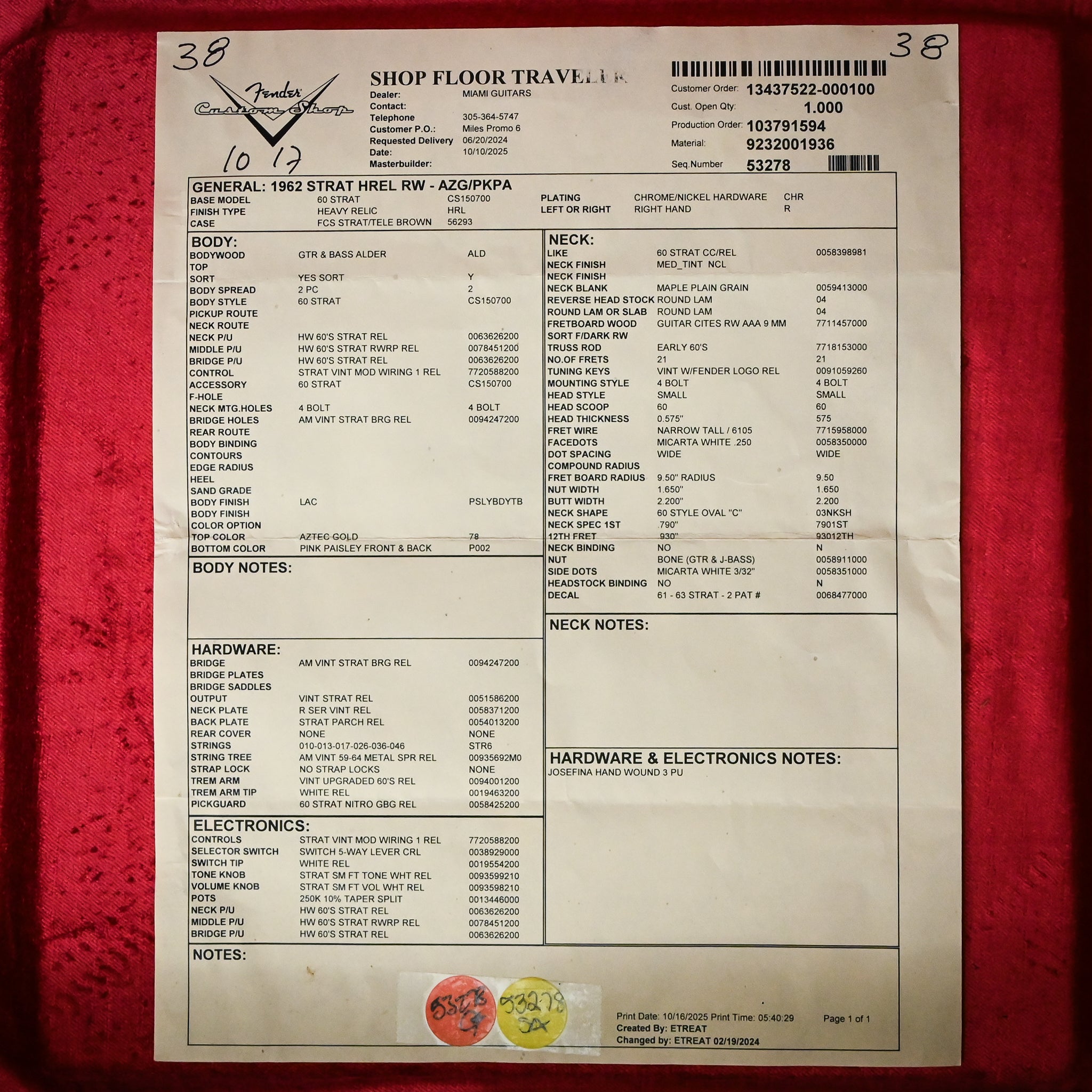 Fender Custom Shop 1962 Stratocaster Heavy Relic Aztec Gold / Pink Paisley Josefina Hand Wound Pickups 2025 (R147398)