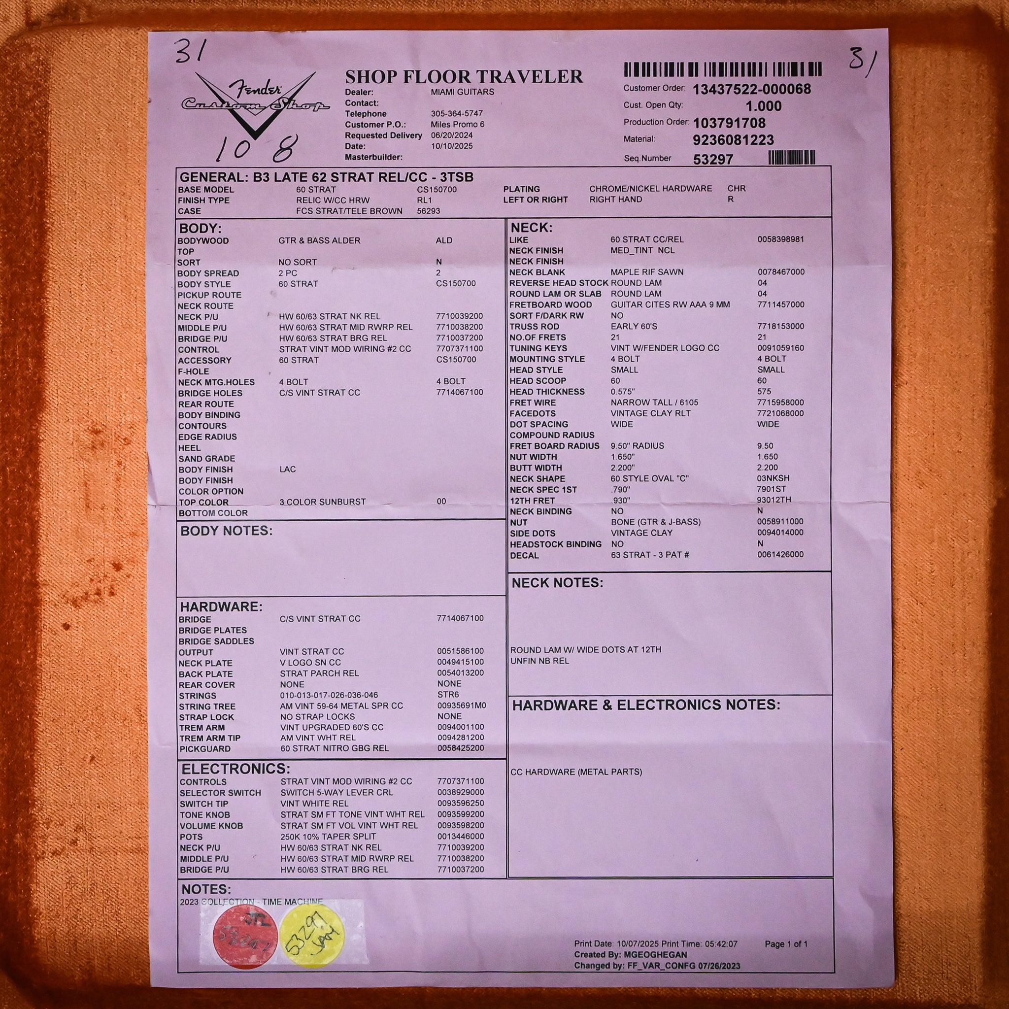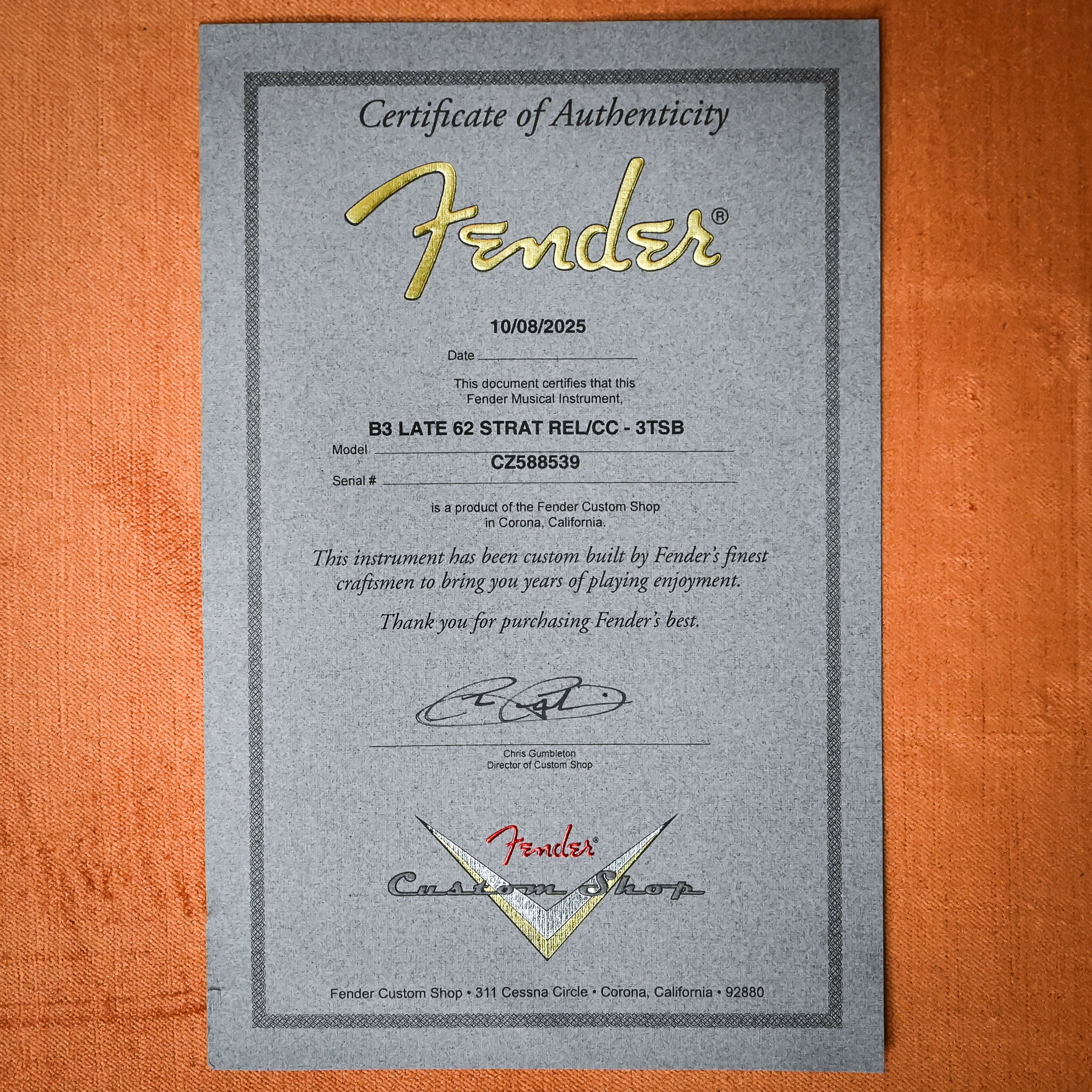 Fender Custom Shop Late-1962 Stratocaster Relic w/ Closet Classic Hardware- 3 Tone Sunburst 2025 (CZ588539)