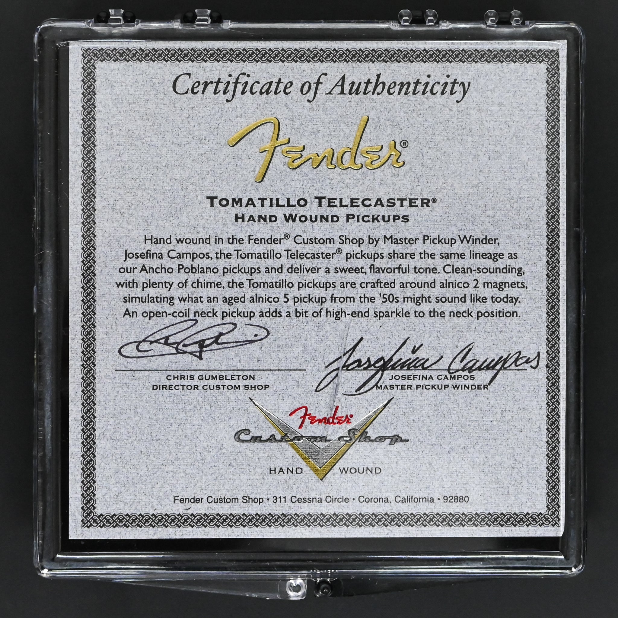Hand wound in the Fender® Custom Shop by Master Pickup Winder, Josefina Campos, the Tomatillo Telecaster® pickups share the same lineage as our Ancho Poblano pickups and deliver a sweet, flavorful tone. Clean sounding and with plenty of chime, the Tomatillo pickups are crafted around alnico 2 magnets, simulating what an aged alnico 5 pickup from the '50s might sound like today. An open-coil neck pickup adds a bit of high-end sparkle to the neck position.