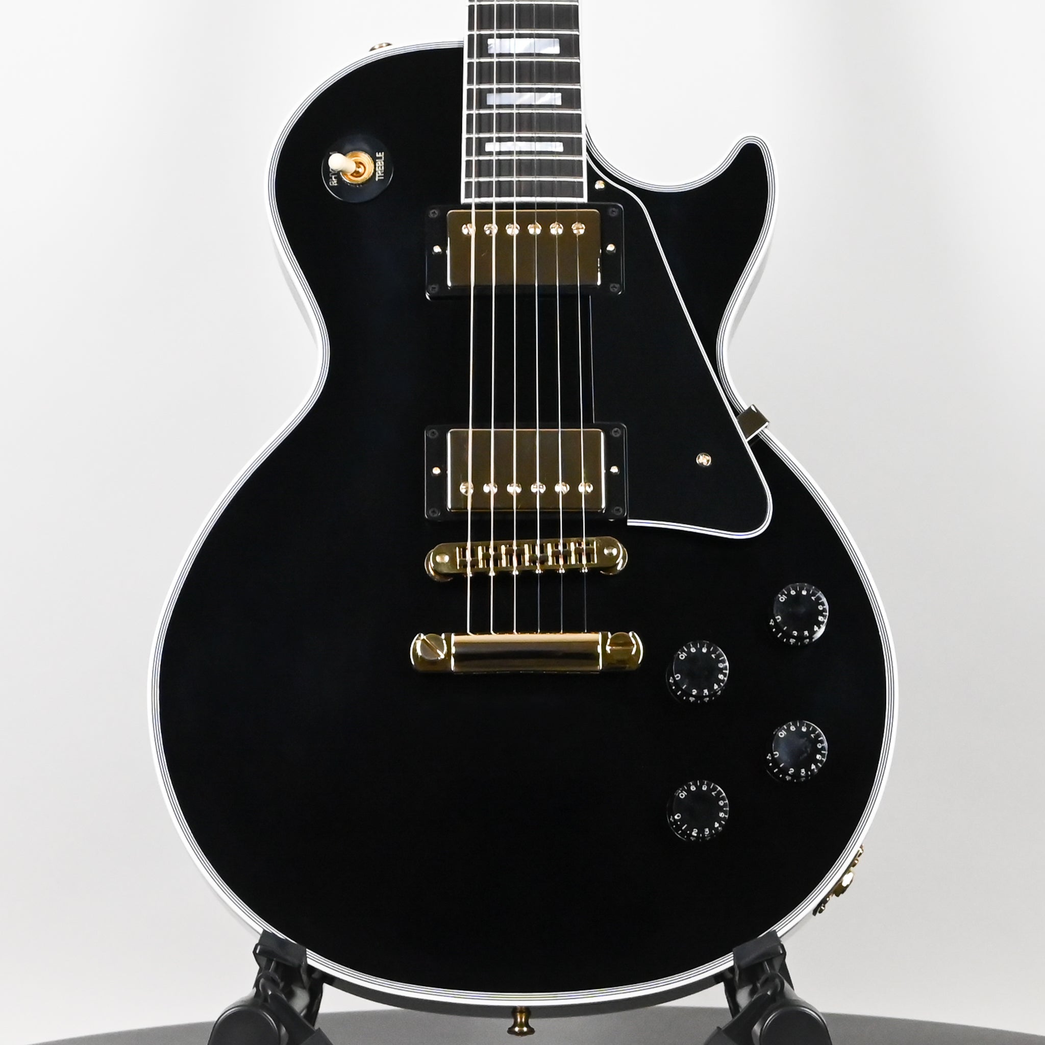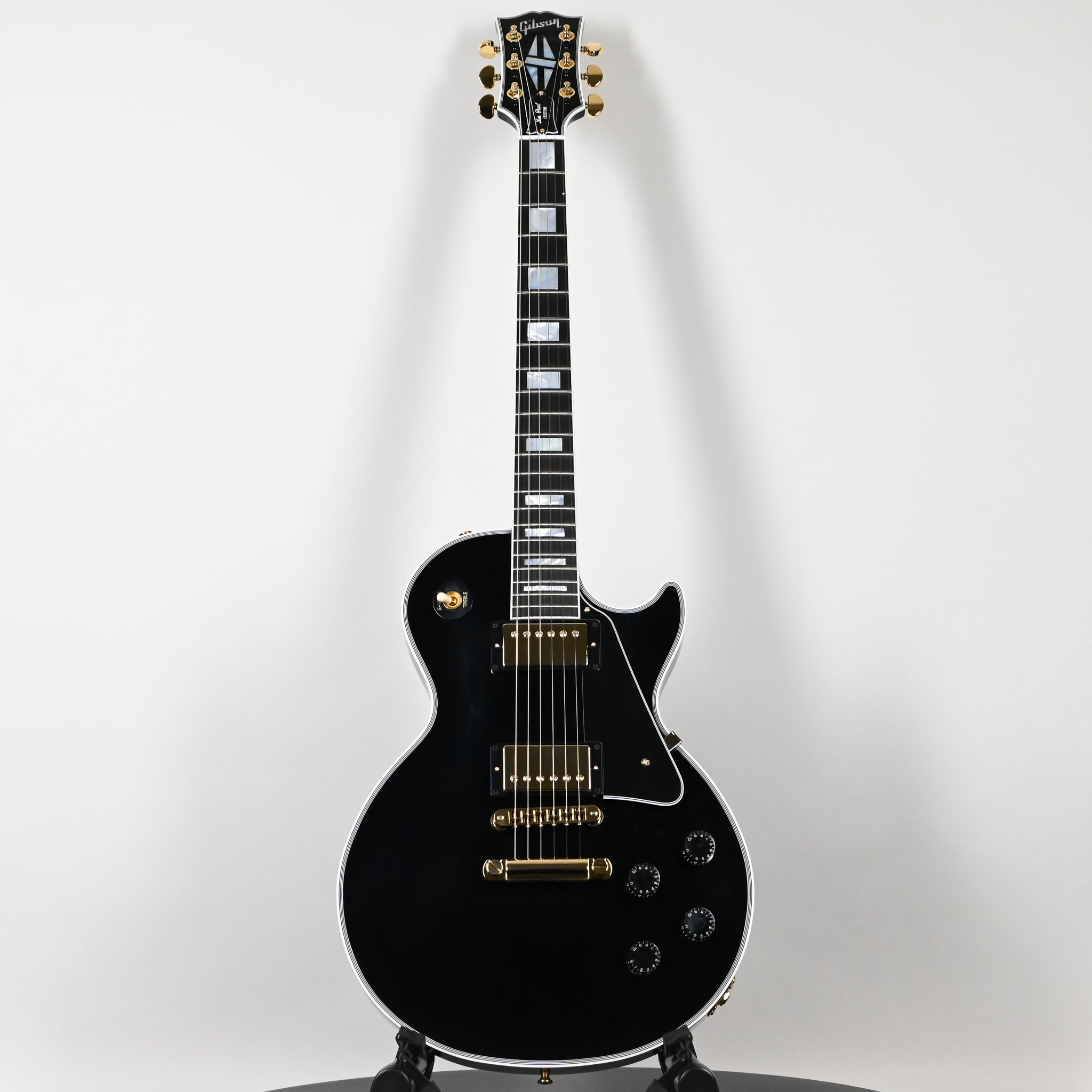 As the flagship model from Gibson Custom, the Les Paul Custom lives up to the high standards set by its 1950s archetype while evolving to a level of tone and performance more suited to today's musical demands. Beneath the layers of its "tuxedo" appointments lies the crisp, edgy voice of a matched 490/498 humbucker set, a solid Ebony fingerboard, a long neck tenon for maximum sustain and a two-piece maple top over a solid mahogany body which adds the perfect amount of sonic bite to everything from jazz to hard rock. It sounds as good as it looks, and it looks as good as it sounds!