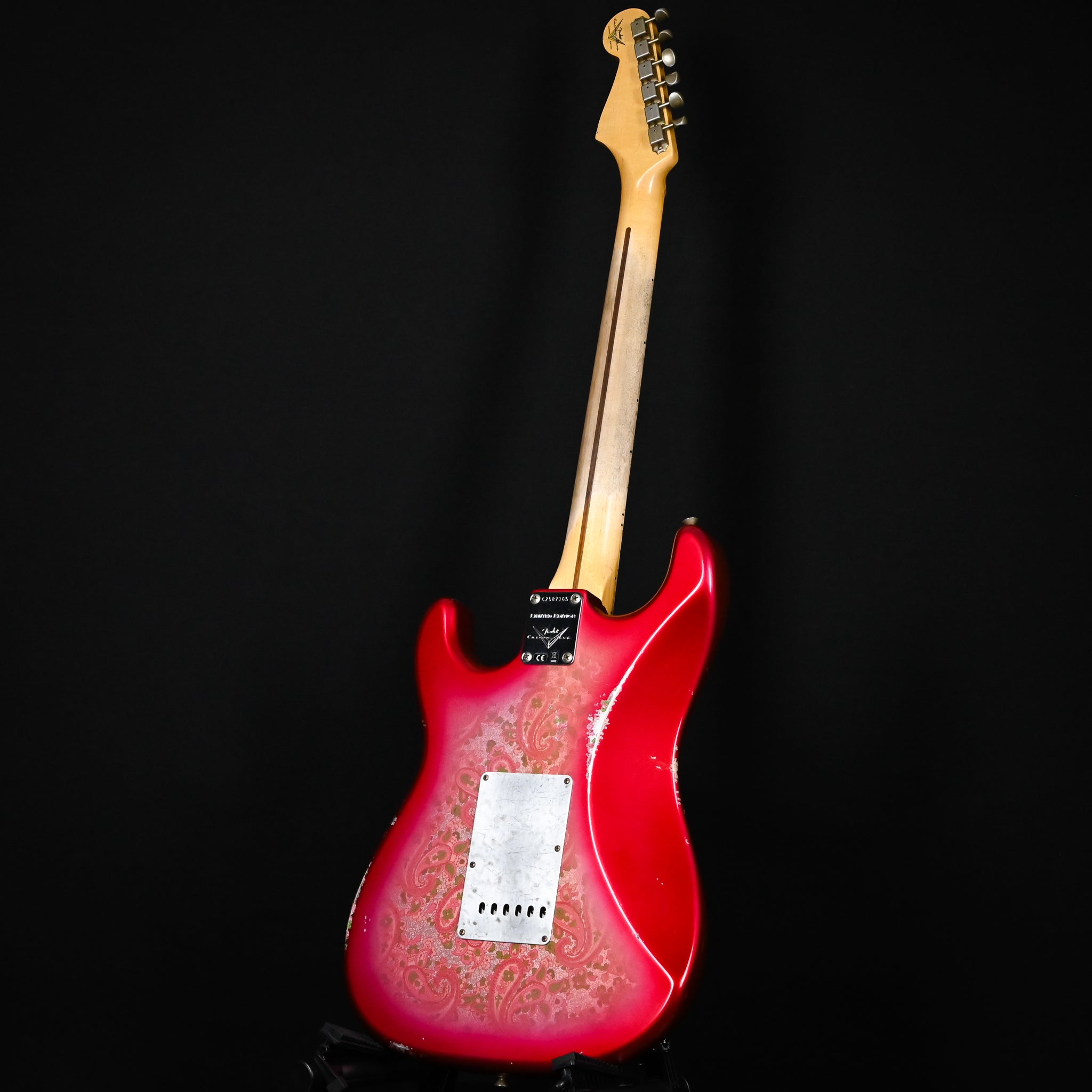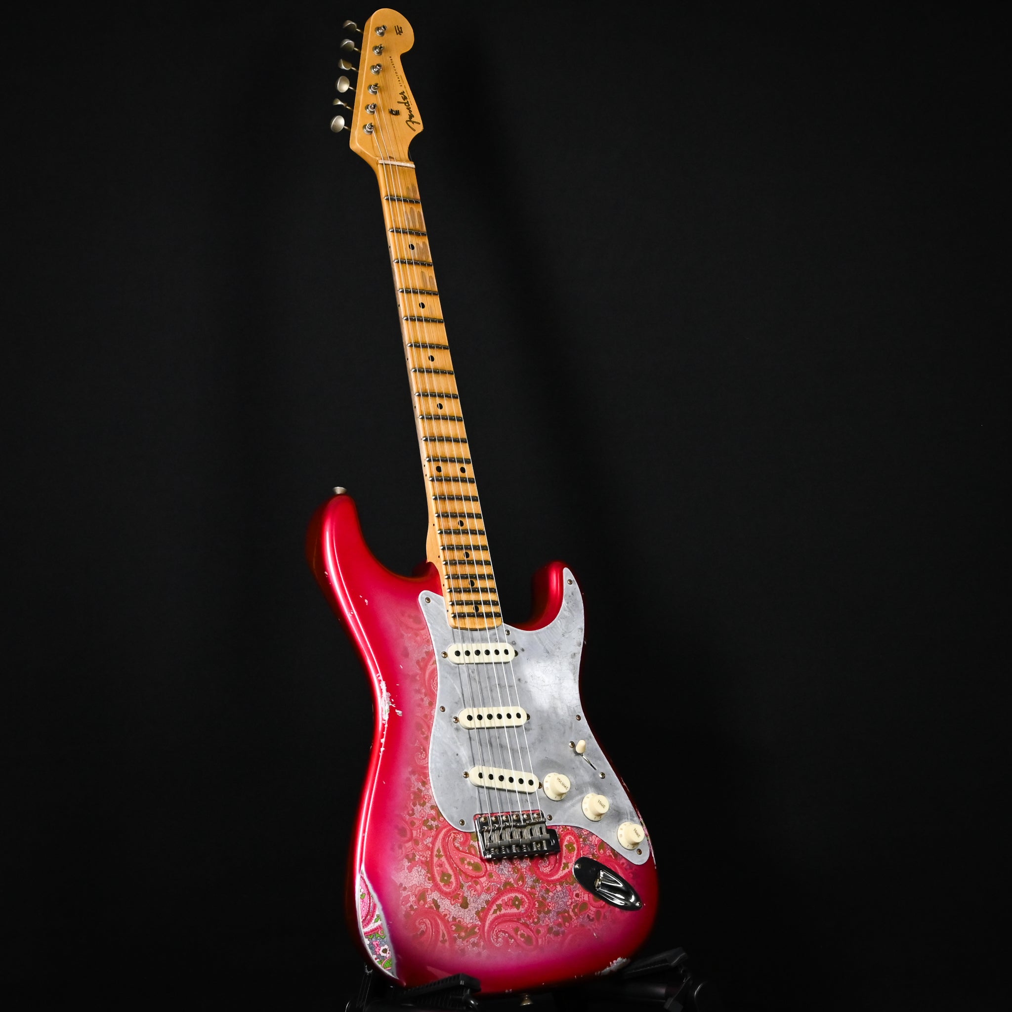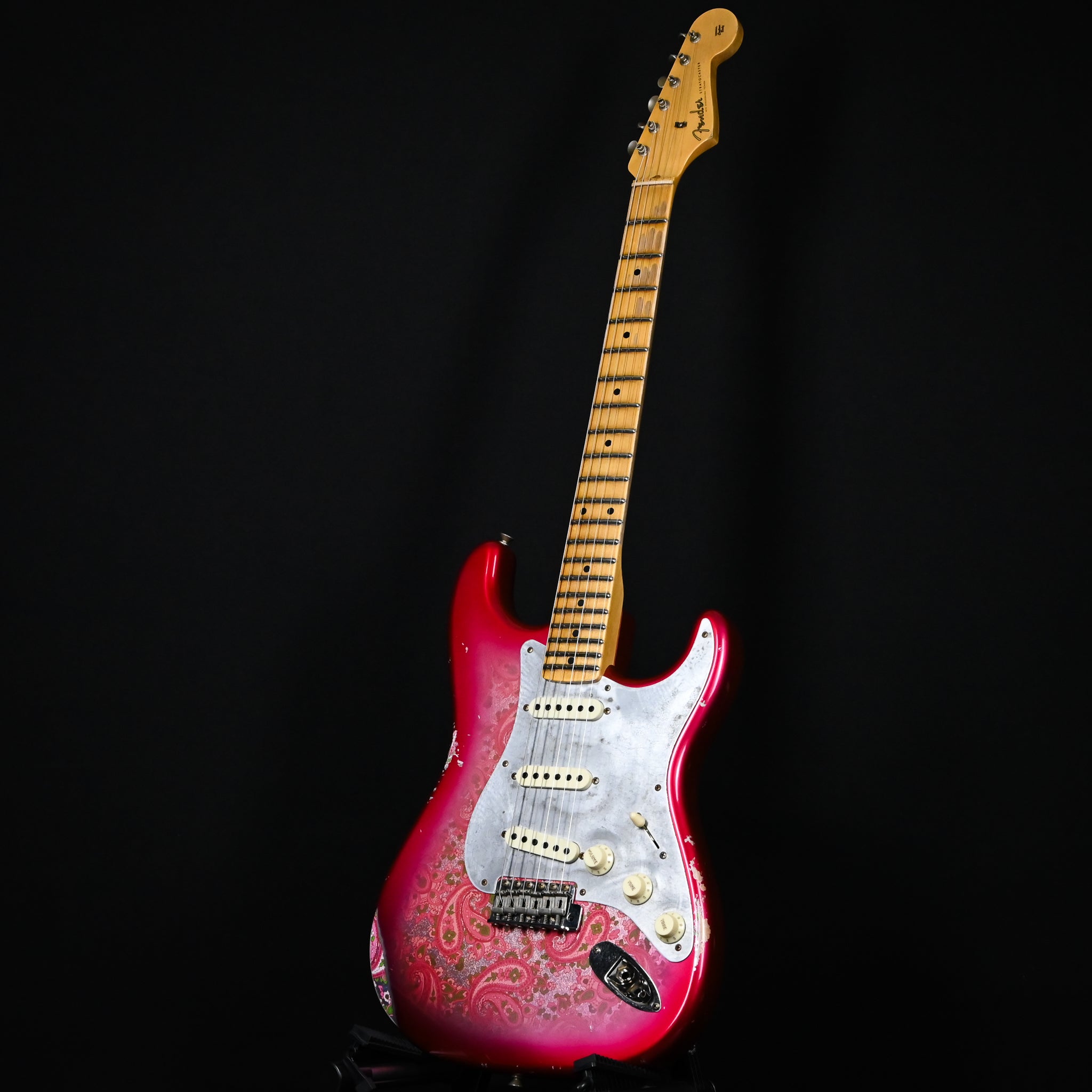 Body Finish: Aged Pink Paisley, Relic Body Material: 2 Piece Alder Neck Pickup: Handwound Strat El Diablo Middle Pickup: Handwound El Diablo RWRP Bridge Pickup: Handwound Strat El Diablo Configuration: SSS Controls: 1 Volume, 2 Tone (Vintage Modified #2 Wiring w/ Tone Saver Bleed) Fingerboard Material: Maple Fingerboard Radius: 9.50” Radius Fret Size: Jumbo Hardware Finish: Chrome