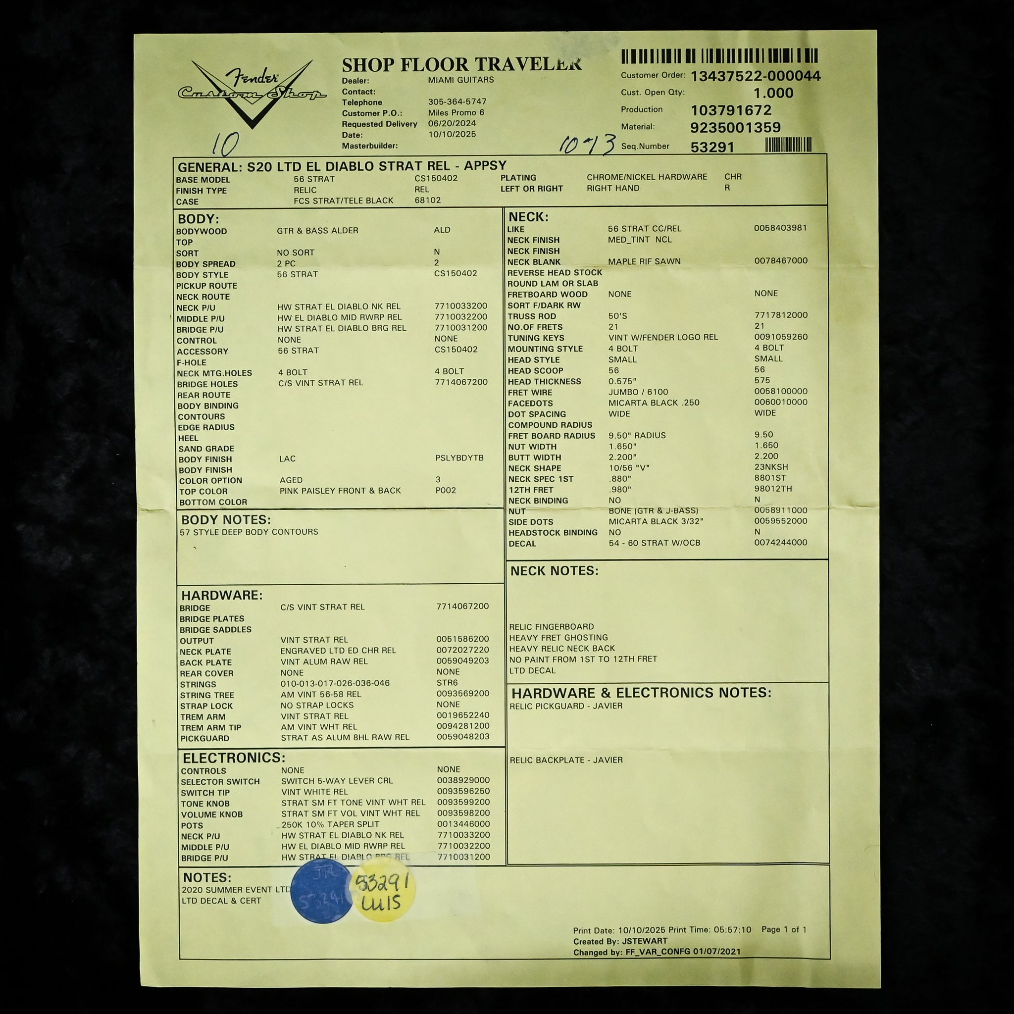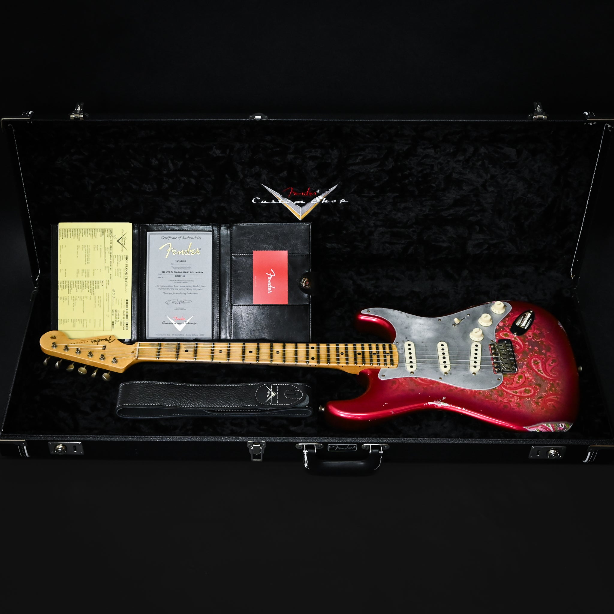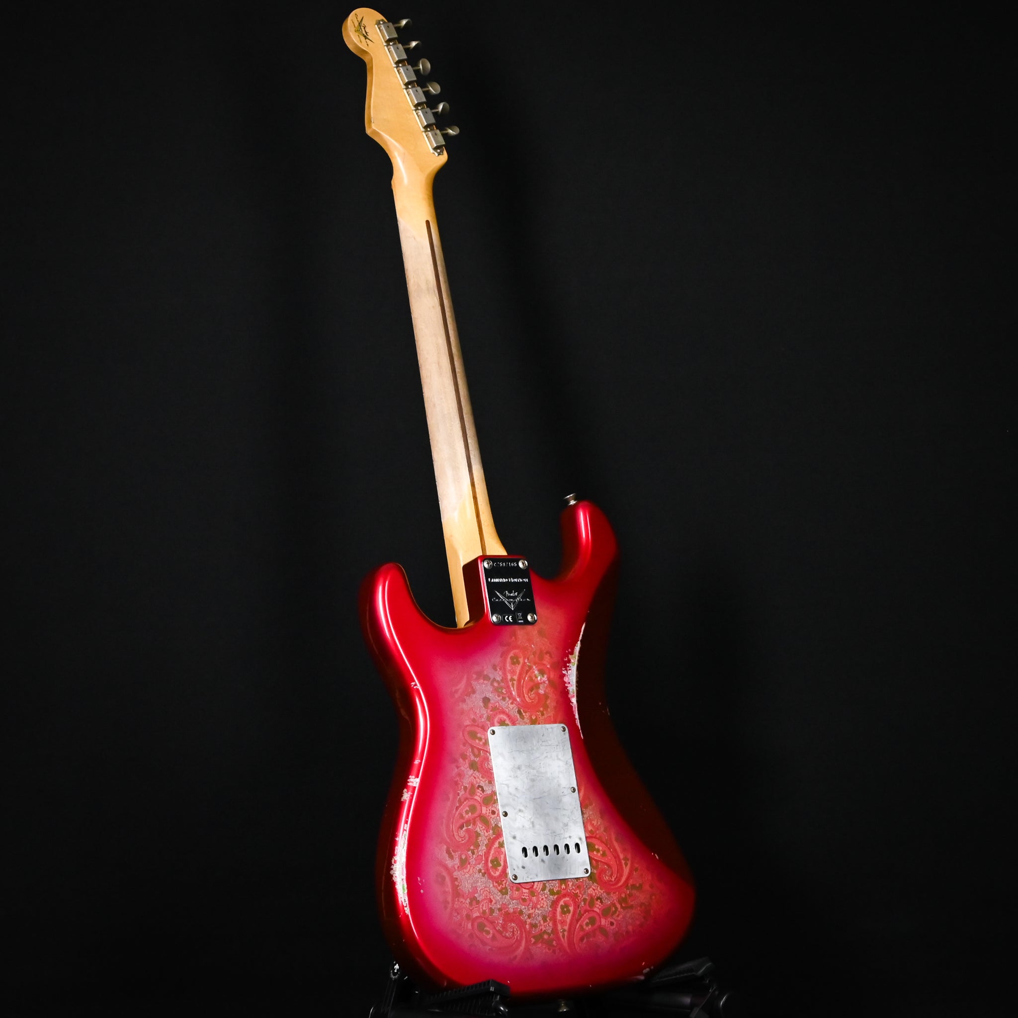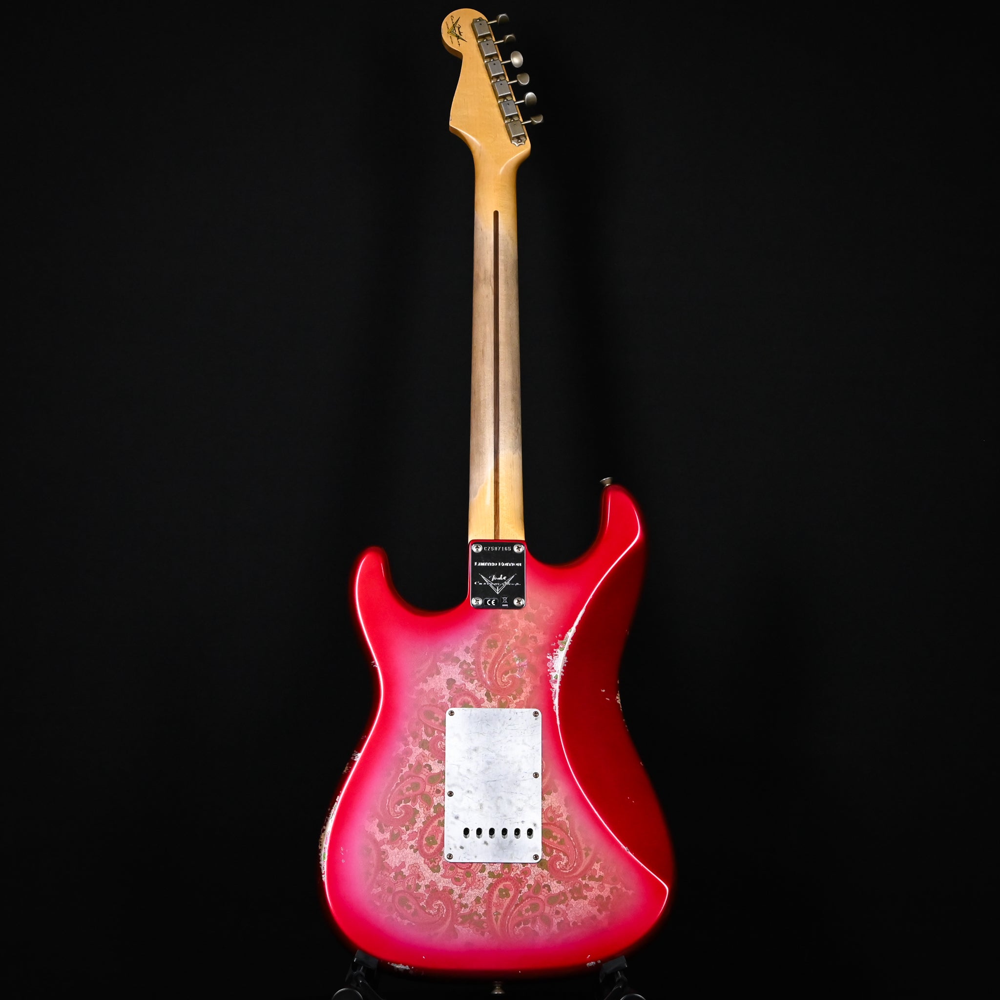 Body Finish: Aged Pink Paisley, Relic Body Material: 2 Piece Alder Neck Pickup: Handwound Strat El Diablo Middle Pickup: Handwound El Diablo RWRP Bridge Pickup: Handwound Strat El Diablo Configuration: SSS Controls: 1 Volume, 2 Tone (Vintage Modified #2 Wiring w/ Tone Saver Bleed) Fingerboard Material: Maple Fingerboard Radius: 9.50” Radius Fret Size: Jumbo Hardware Finish: Chrome