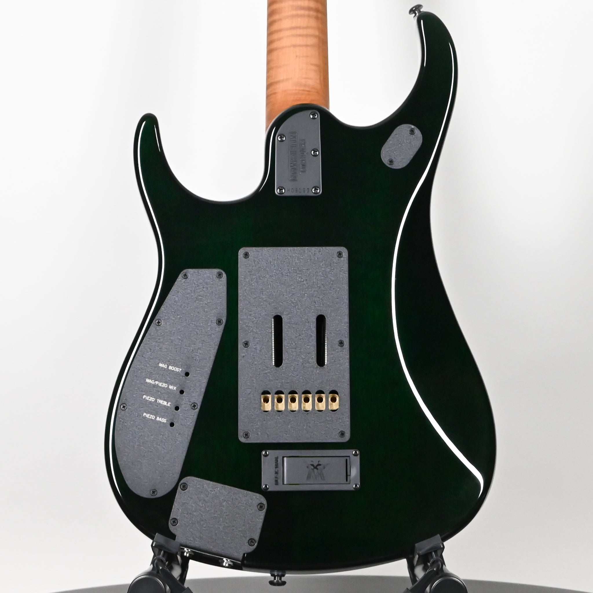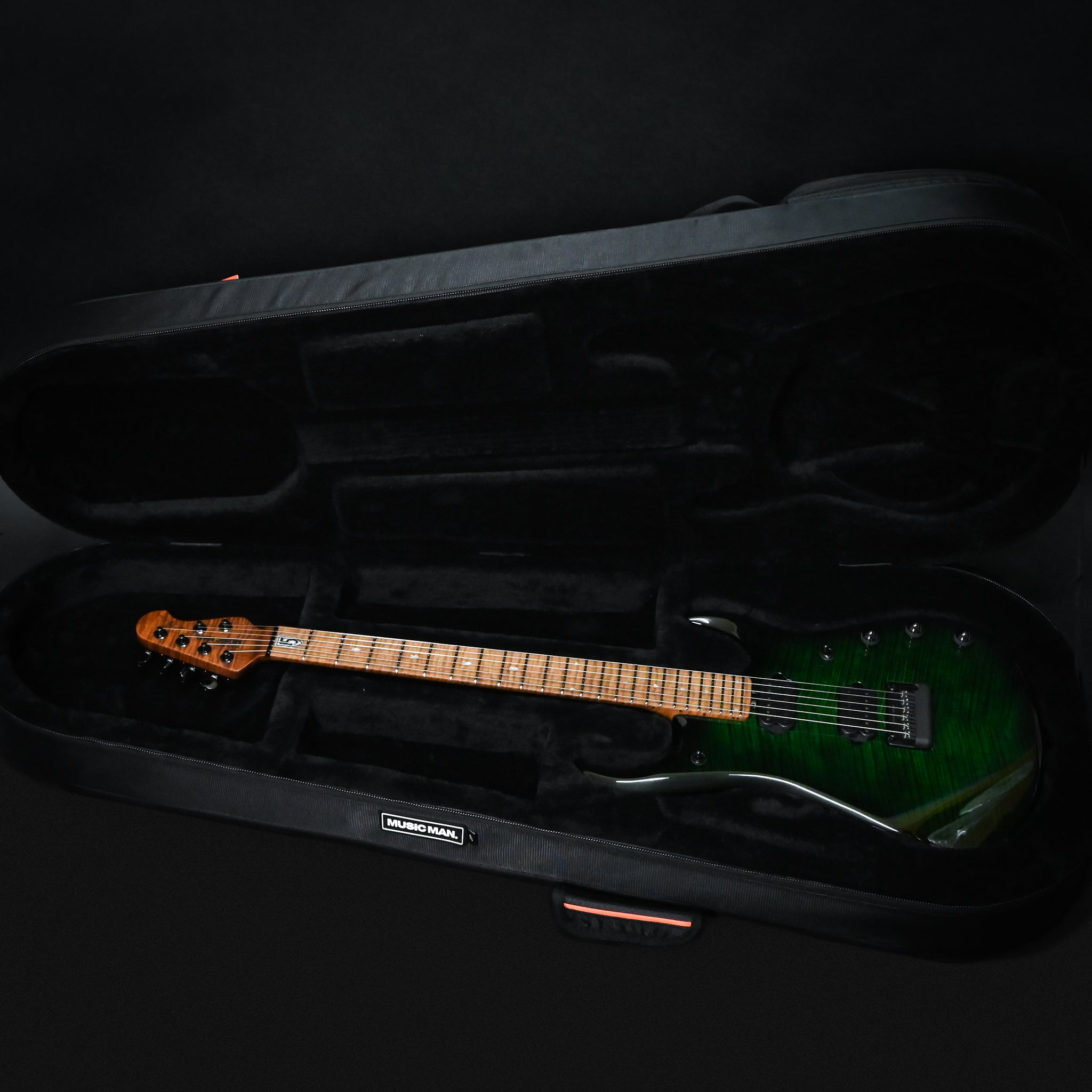 The JP15 features a lightweight okoume body with your choice of a quilted or flame maple top, offered in striking Red Tide, Green Tiger Eye, Ultramarine, and Amber Waves finishes. Its roasted figured maple neck and fingerboard deliver a smooth, fast-playing surface enhanced by stainless steel frets and a hand-rubbed oil and wax finish for natural comfort. Electronics include DiMarzio Illuminator pickups, a piezo-equipped bridge for realistic acoustic tones, and an onboard 20+dB gain boost for added punch and tonal range. The piezo system supports mono or stereo output, letting you route magnetic and piezo signals through separate chains. Two 3-way toggle switches give you full control—one selects between magnetic, piezo, or combined output, while the other toggles between bridge, neck, or both magnetic pickups. A push/push tone knob splits the coils in the middle position for added versatility. Additional features include a floating Music Man JP tremolo, locking Schaller tuners, and a Mono case, with 6- and 7-string configurations available.