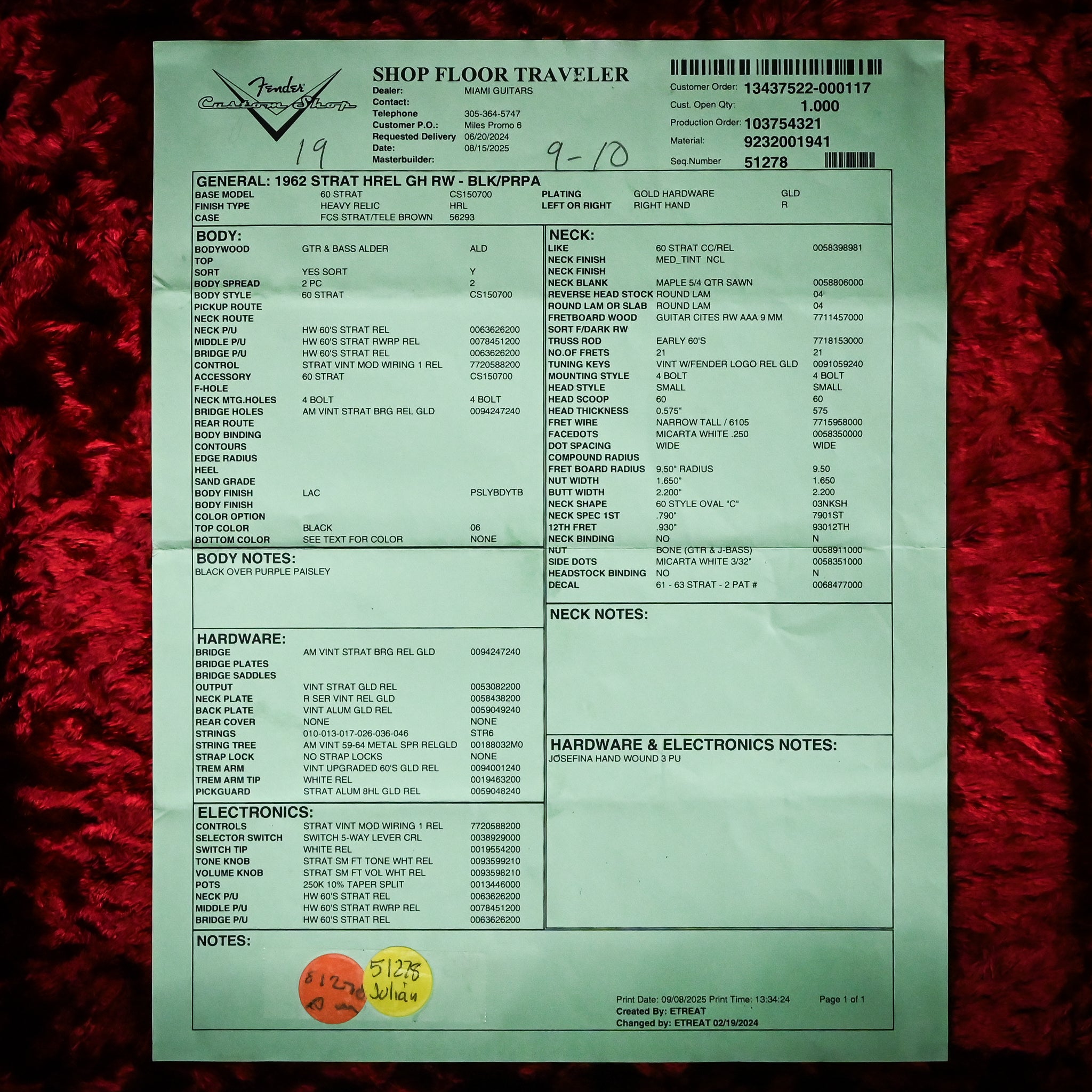 Fender Custom Shop 1962 Stratocaster w/ Gold Hardware & Josefina Handwound Pickups, Heavy Relic- Black/ Purple Paisley 2025 (R139564)