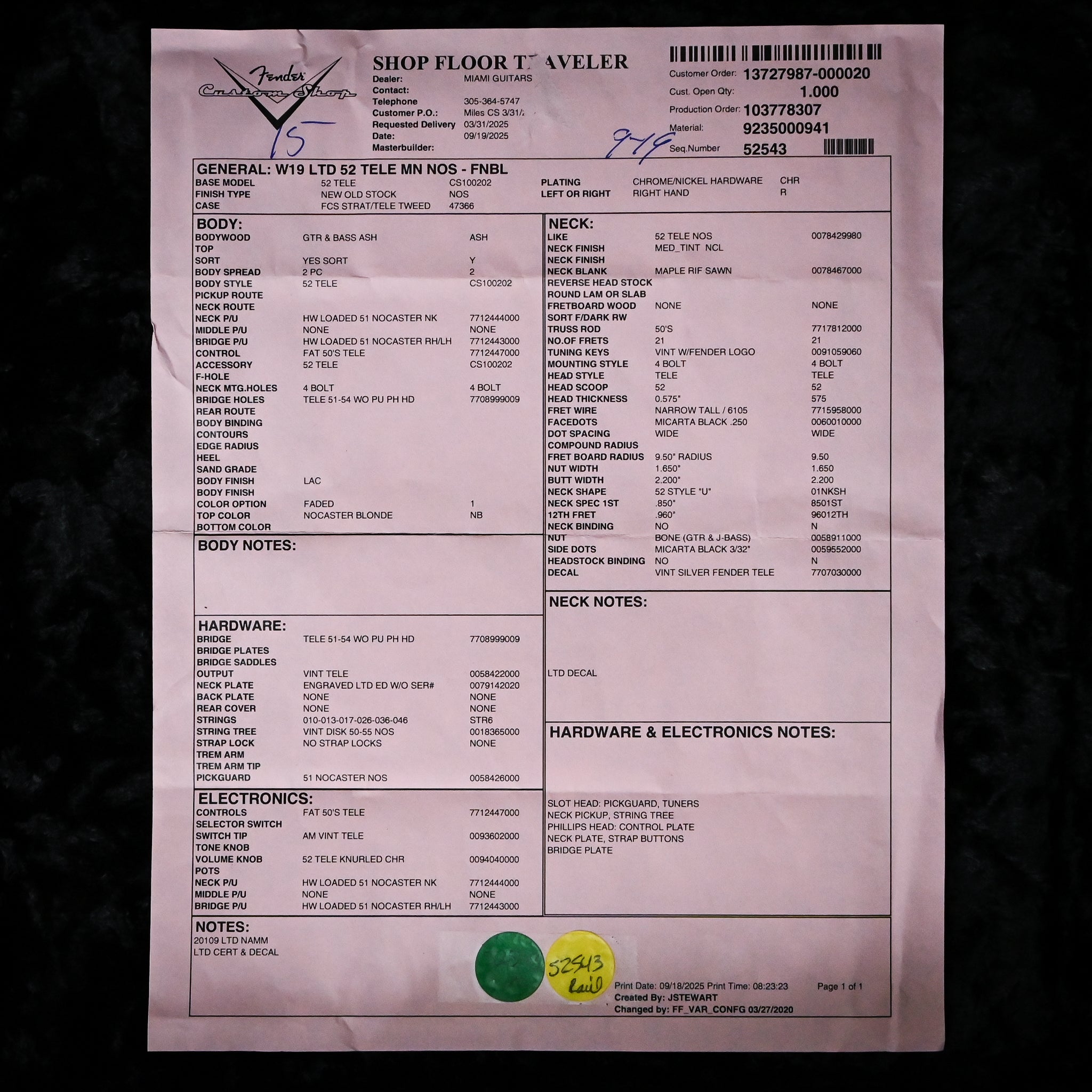 Bridge: '51-'54 Tele Bridge Neck Finish: Medium Tint Nitrocellulose Lacquer Neck Material: Rift Sawn Maple Neck Shape: '52 Style "U"