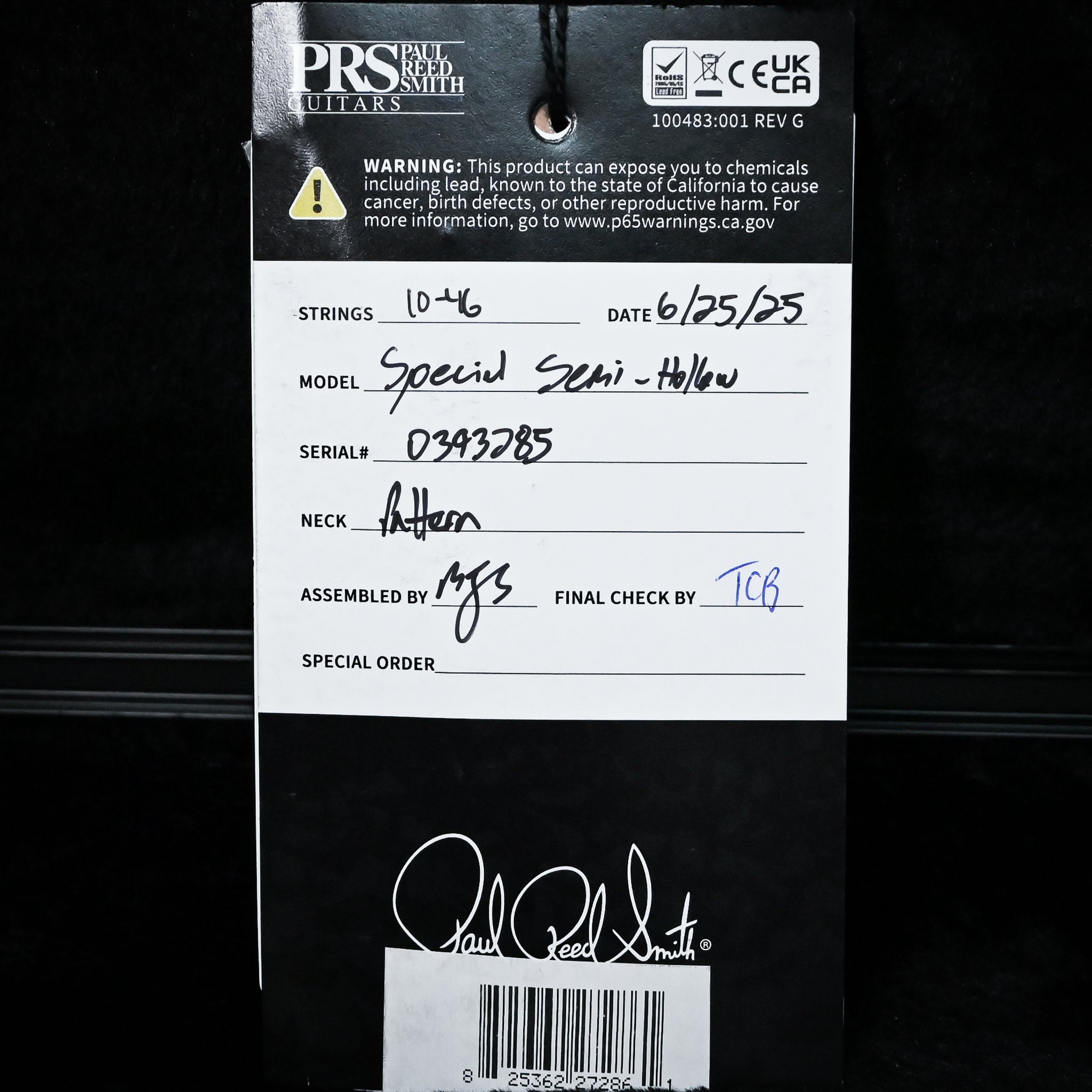 Additional specifications on the PRS Special Semi-Hollow include a maple top, mahogany back, 22-fret 25” scale length mahogany neck, rosewood fretboard, Phase III locking tuners with wing buttons, and the PRS Gen III patented tremolo.