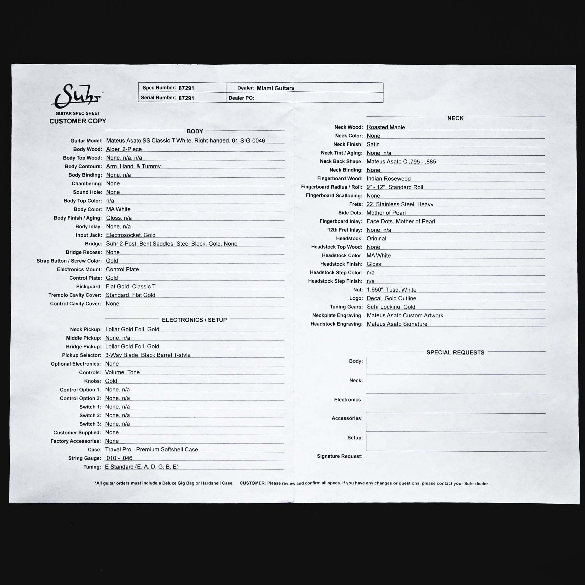 The Mateus Asato Signature Suhr Classic T in ‘M.A.’ White, with its timeless style and unmatched build quality, it’s a reborn Classic you’ll love playing for years to come.