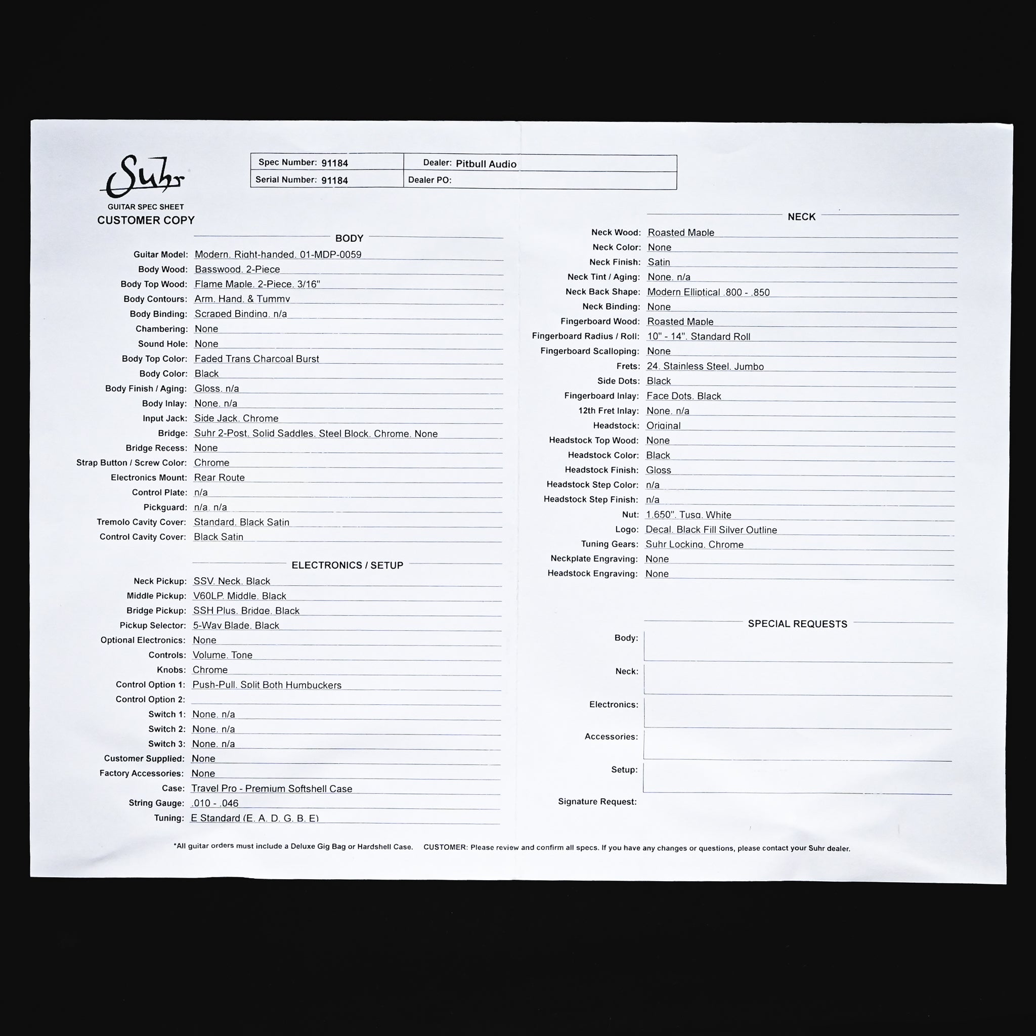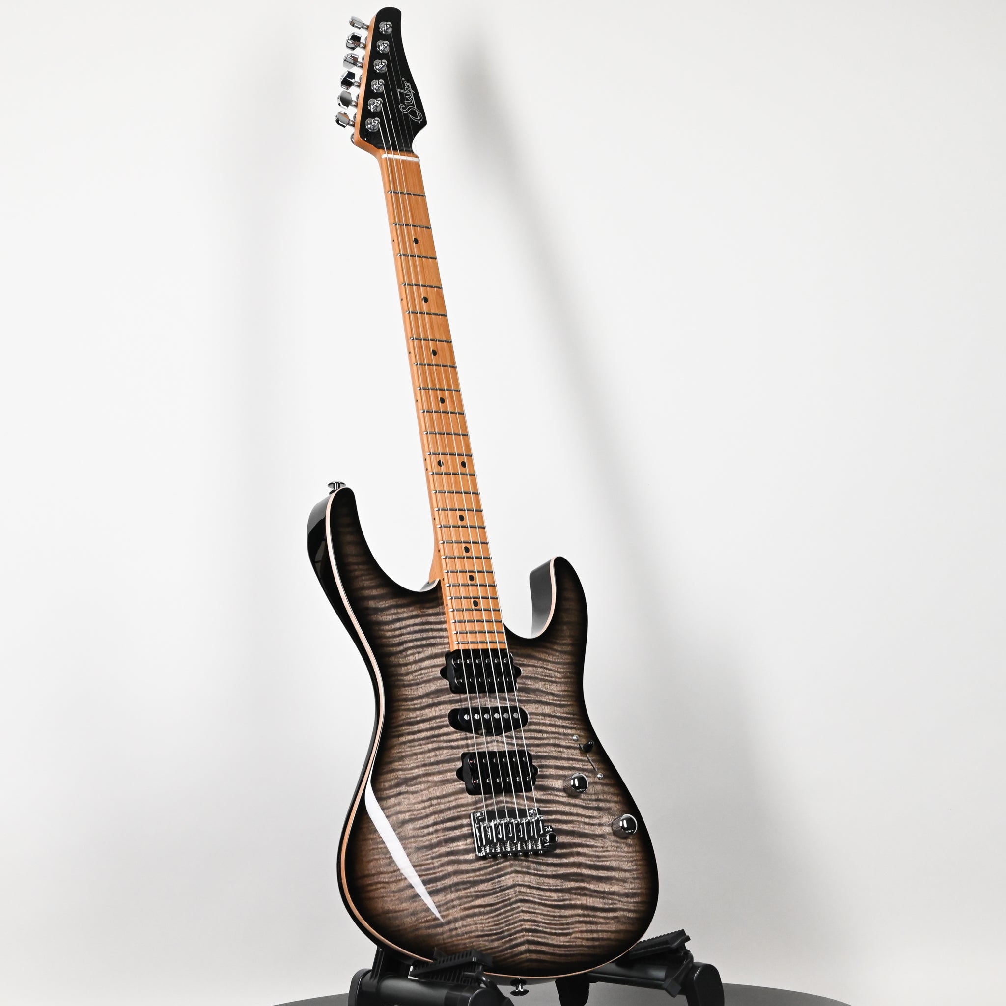 The Modern Plus features a roasted maple neck with pau ferro or maple fingerboard. The Modern Plus retains many of the original specifications of the Modern Pro including the sleek elliptical neck profile, balanced asymmetrical body, innovative neck heel and stunning flame maple top. Proprietary Suhr locking tuners and 2-Post tremolo provides superior tuning stability.
