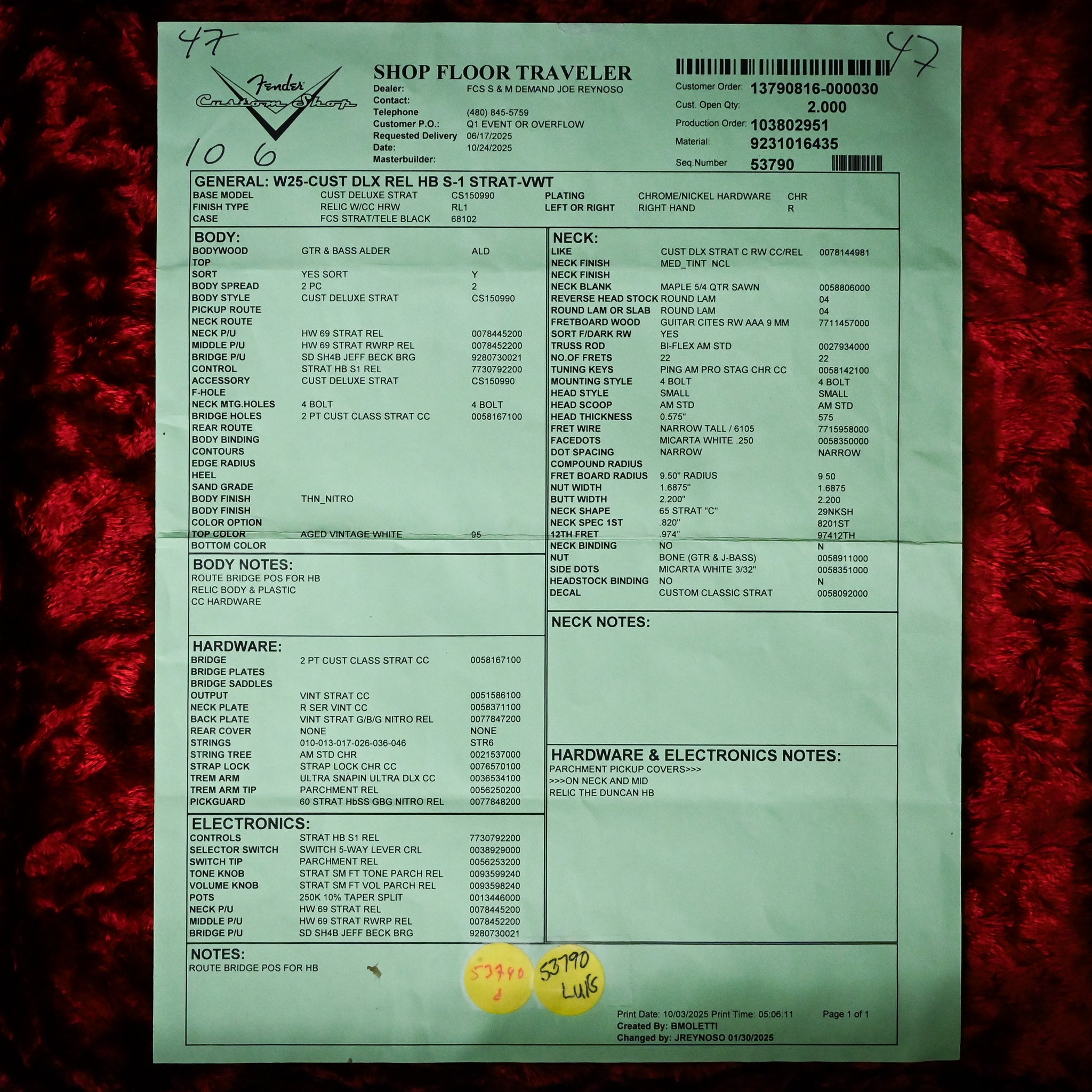 Fender Custom Shop Deluxe Stratocaster w/ Seymour Duncan SH4B Humbucker, Relic/ Closet Classic Hardware- Aged Vintage White 2025 (R146312)