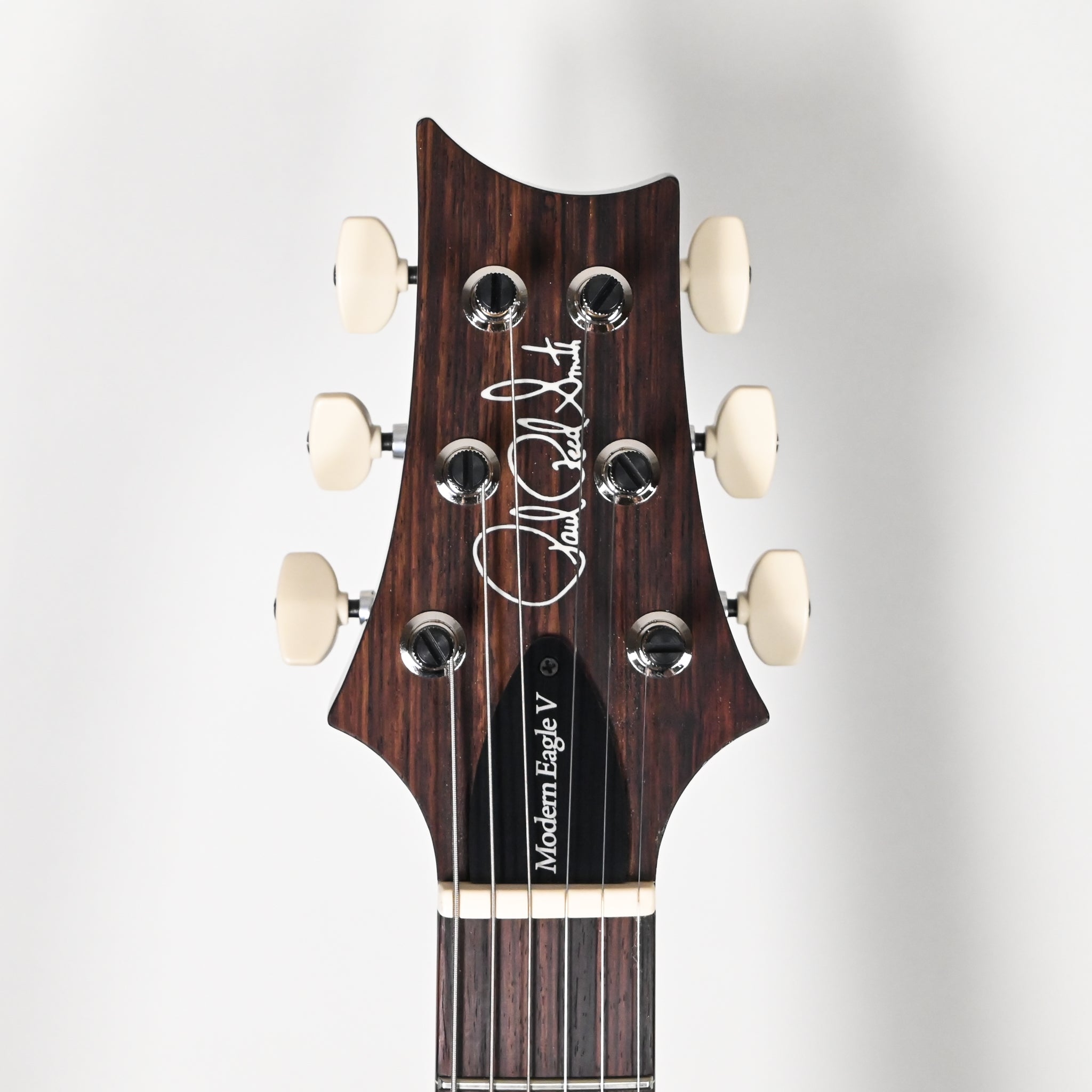 The Modern Eagle V offers highly musical tones for both recording and playing live. A mix of classic and modern, the Modern Eagle V is built on a tried-and-true foundation of a maple top and mahogany back, a 22 fret, 25” scale length, Pattern mahogany neck with rosewood fretboard, bone nut, PRS Phase III Tuners, and the PRS patented Gen III tremolo. Its innovative pickup and electronics configuration puts a wide range of tones at your fingertips.