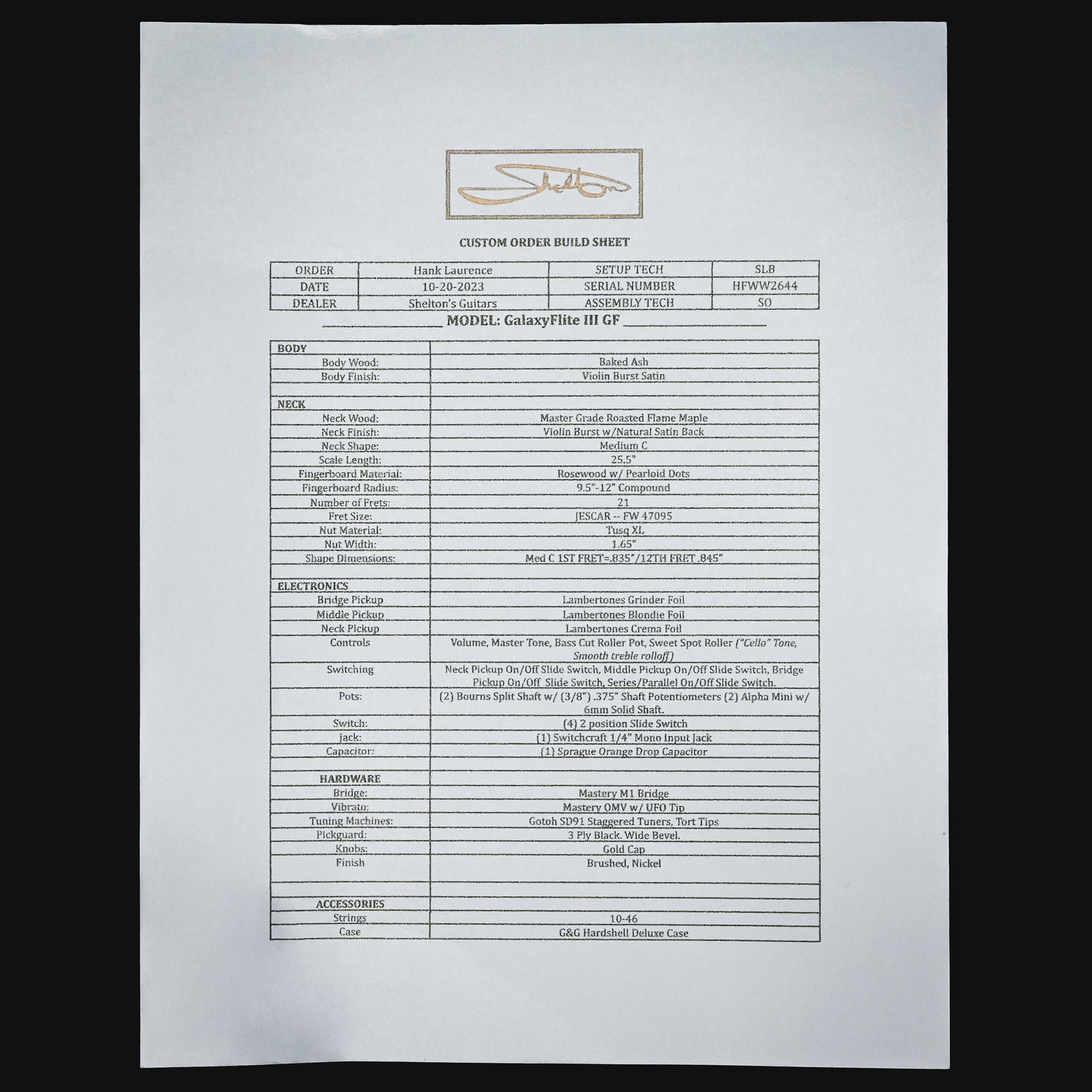 Shelton Galaxy Flite III GF Electric Guitar- Violin Burst Satin 2023 (HFWW2644)